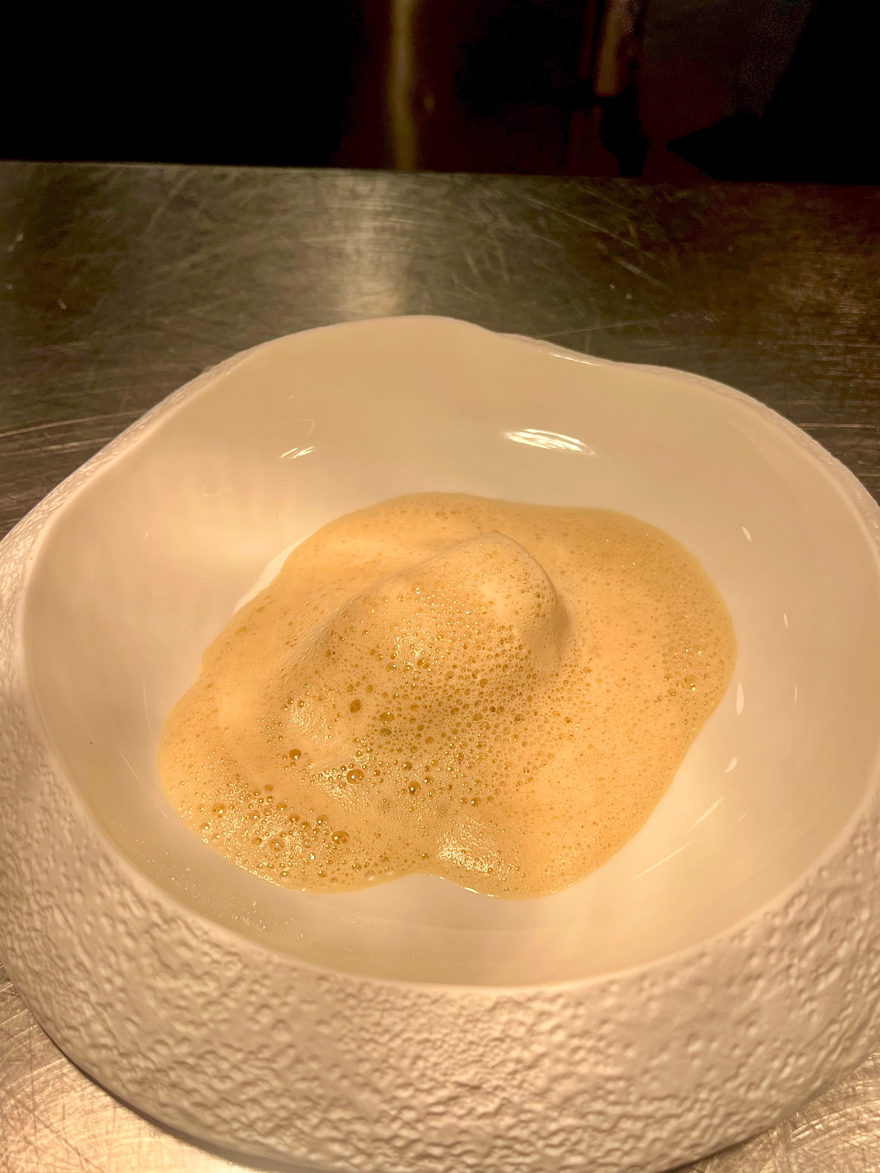 Le Saumon, en ceviche, lait de coco, râpé de combawa, poudre de chips de crevette : belle découpe et texture du saumon sauvage au gras suave et enveloppant. Il frétille dans le lait de coco infusé à la citronnelle et au galanga qui est monté en émulsion pour lui apporter une touche veloutée. Les chips de crevettes en poudre, au visuel presque neigeux, délivrent une texture et une dimension crispy assumée. Les zestes de Combawa sont la fraîcheur attendue et le punch qui finalise le tout. Tout est en parfait accord et nous fait partir dans l’univers des « Night Markets » de Bangkok avec ses incontournables et savoureux Tom Kha Gai.