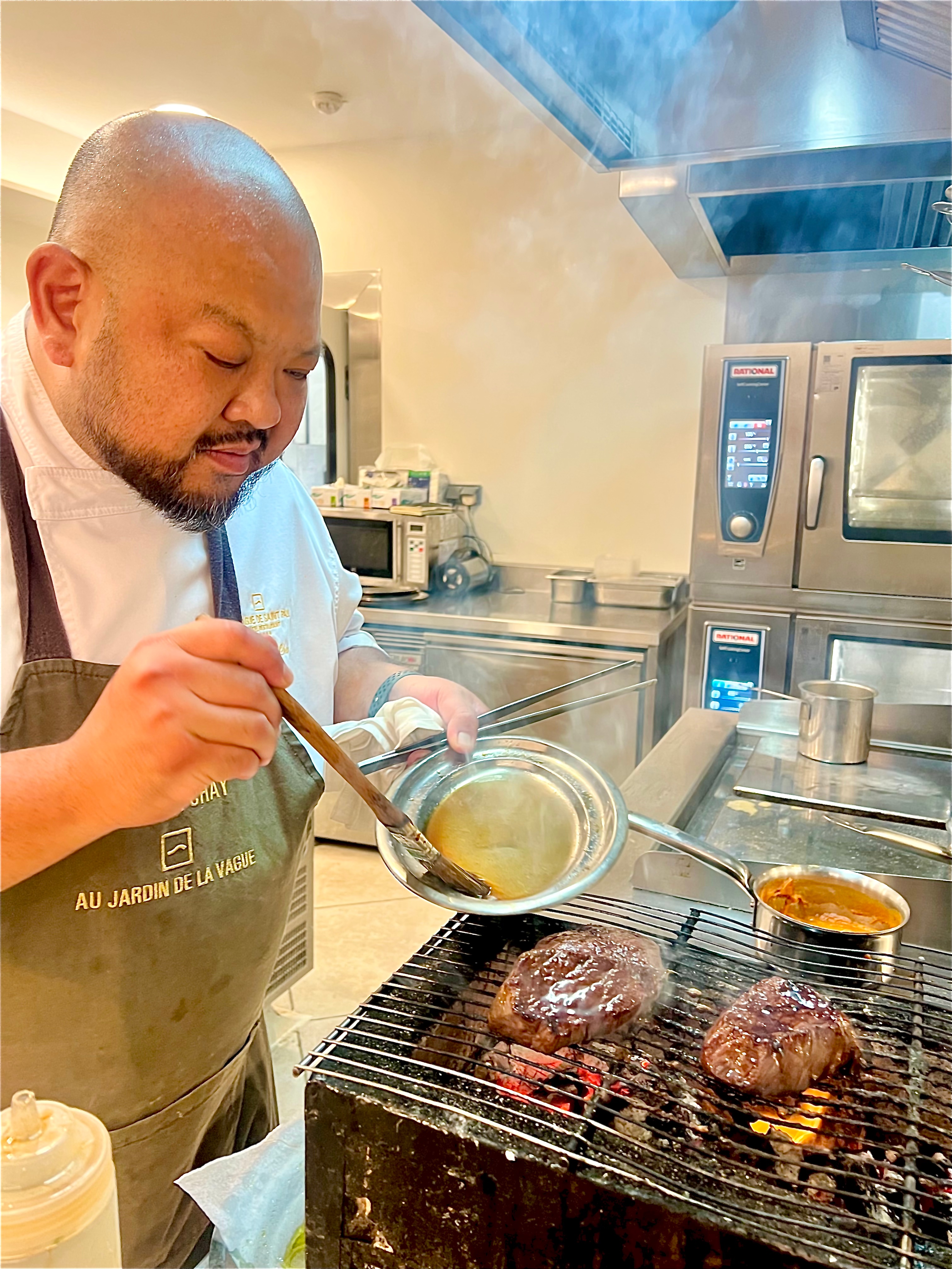 Il partage avec vous sa passion d’une cuisine vibrante et aimante, inspirée de Méditerranée et des souvenirs de son enfance et de ses origines, (une maman cambodgienne et un papa thaïlandais) aux saveurs de son Asie. Quel bonheur de sentir, d’entendre et de vivre l’action maîtrisée et sereine de la brigade, de voir le chef griller la viande ou le poisson sur son Hibachi en pierre de lave du Mont-Fuji patiné par les années, de voir les assiettes des autres clients partir en salle… Vous avez alors ce sentiment privilégié d’être en coulisse et de partager un moment intime et privé avec le chef dans son antre du feu.