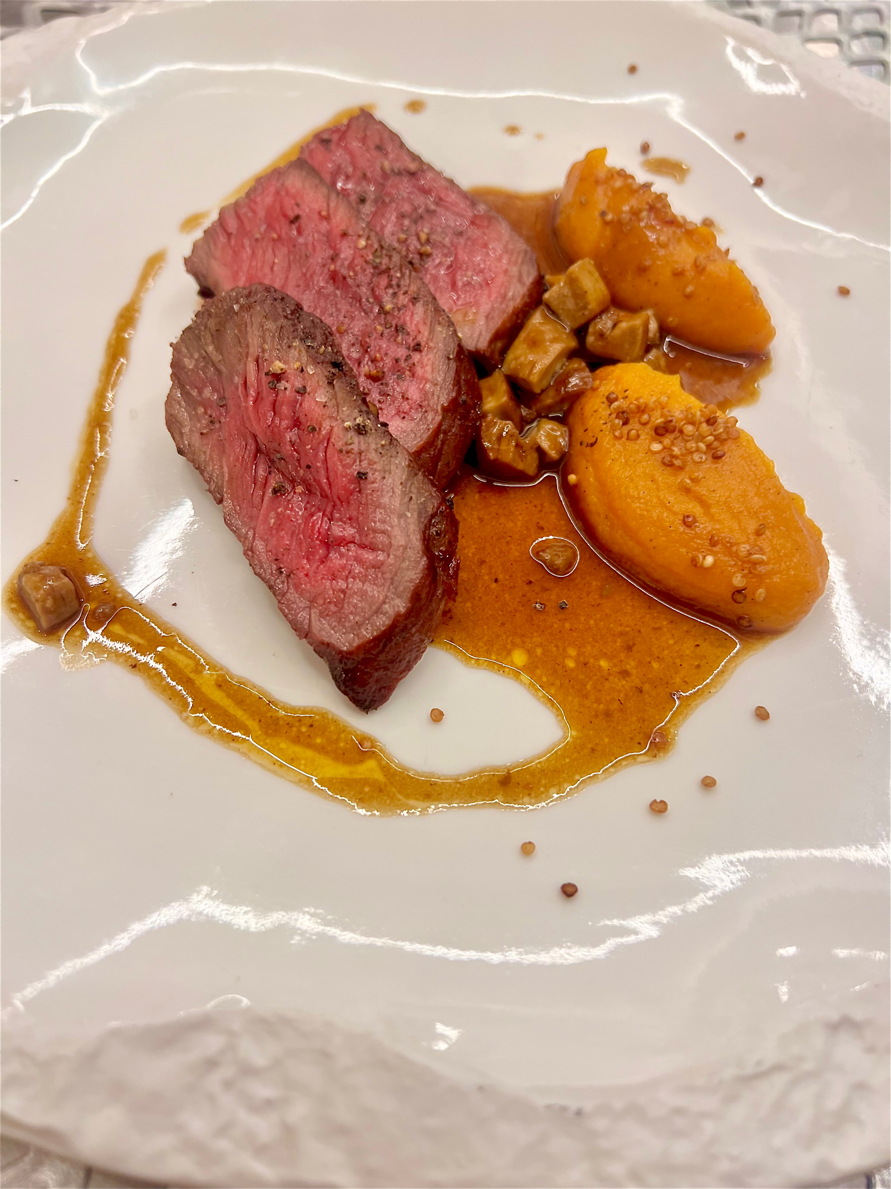 Le bœuf, rumsteak mariné façon Thaï grillé au barbecue Hibachi, mousseline de patate douce à la vanille – jus aux éclats de foie gras : cette belle pièce marinée se nourrit, se glace et se caramélise du jus et des flammes de l’hibachi, la cuisson est idéalement celle qu’il faut, la patate douce vanillée et lissée en mousseline s’éclate du foie gras qui apporte sans complexe sa grande référence festive. Le jus de champignons au lard et madère vient embrasser ce monde réconfortant et viandard.