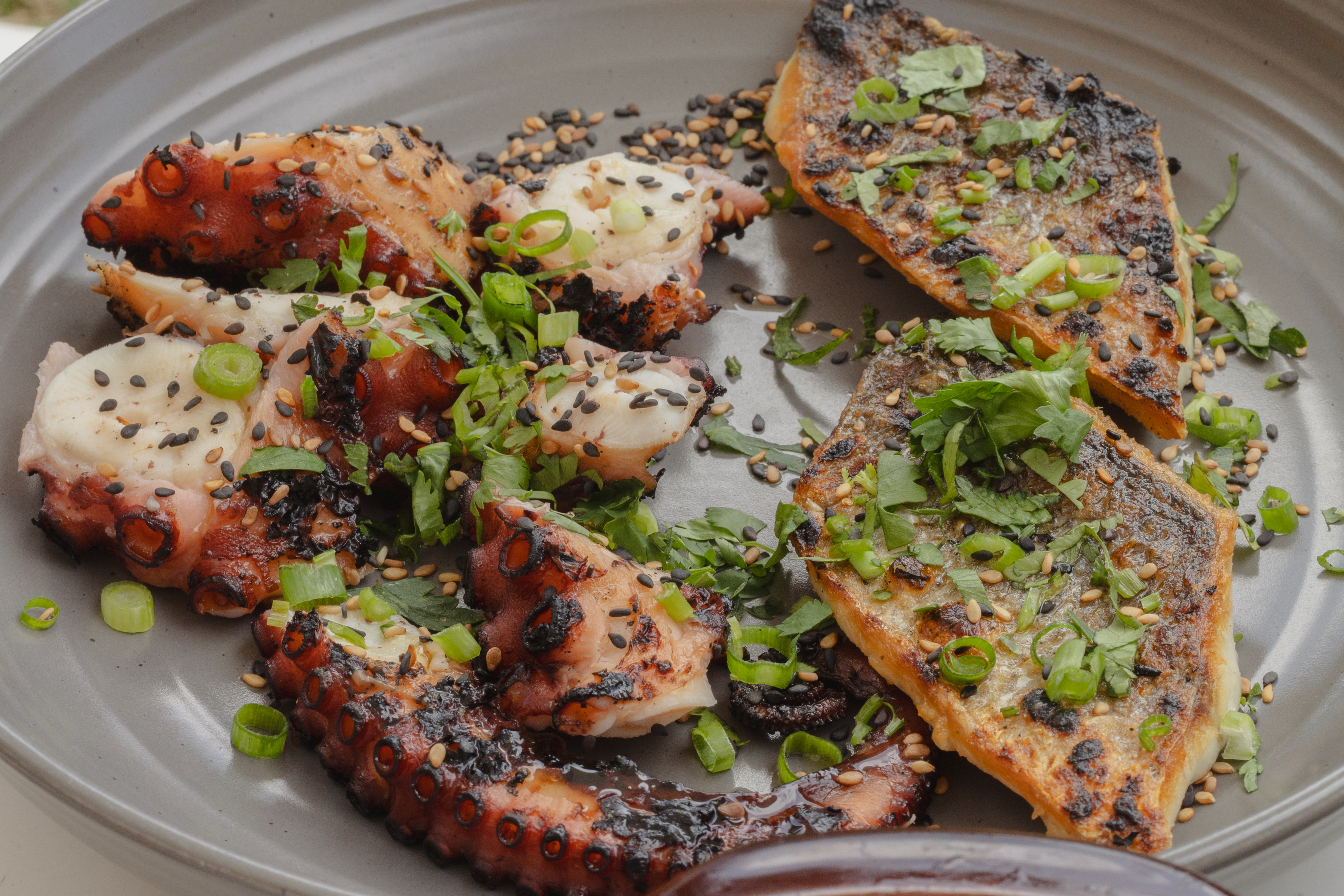 Le Poulpe, la tentacule en tempura japonaise, duo de condiments pimentés et mayonnaise japonaise fraîcheur de cébette : l’identitaire poulpe, cuit en douceur à basse température, se japonise infiniment de sa fine tempura-panko et se percute d’un savoureux duo coloré de condiments à base de la fameuse « mayonezu » (マヨネーズ). L’une avec du miel de soja et de l’huile de sésame et l’autre au piment. Les zestes minutes d’orange délivrent le kick agrume d’une pointe douce. Ici, à nouveau, l’ensemble se fait justement cadencé entre le moelleux du poulpe, sa coque en croustille et les sauces. Tout fait plaisir et donne une envie incontrôlée d’y retourner.