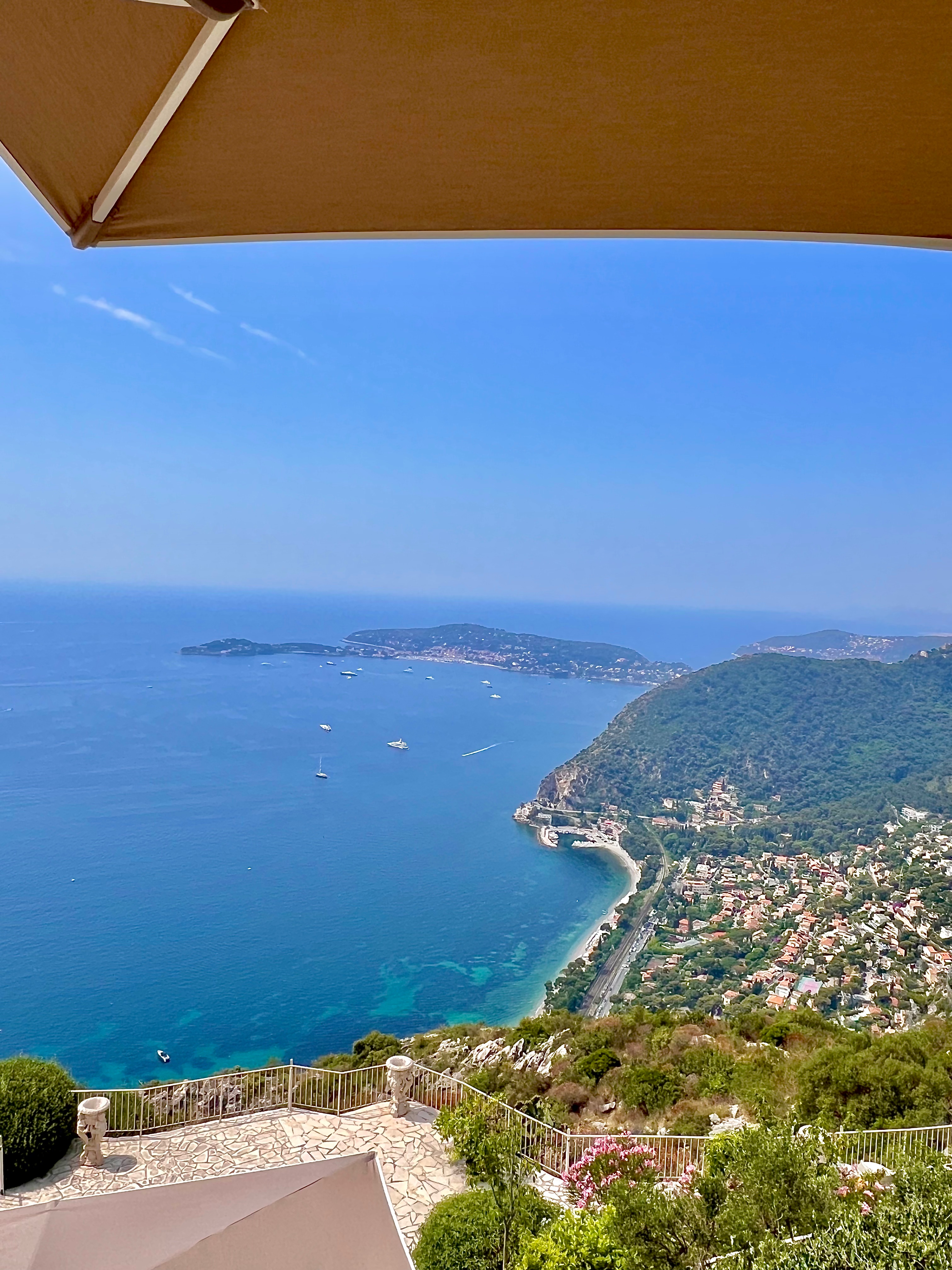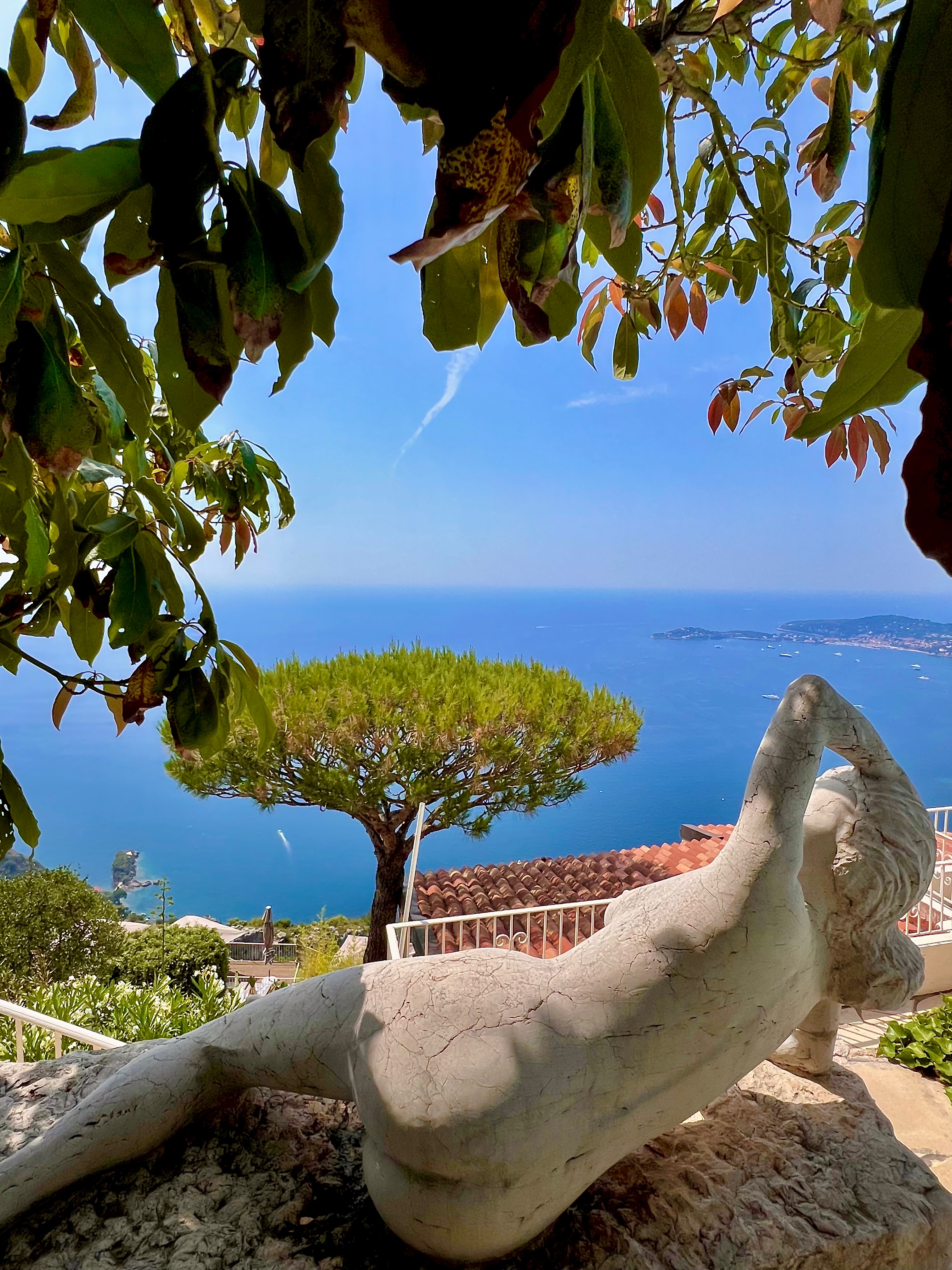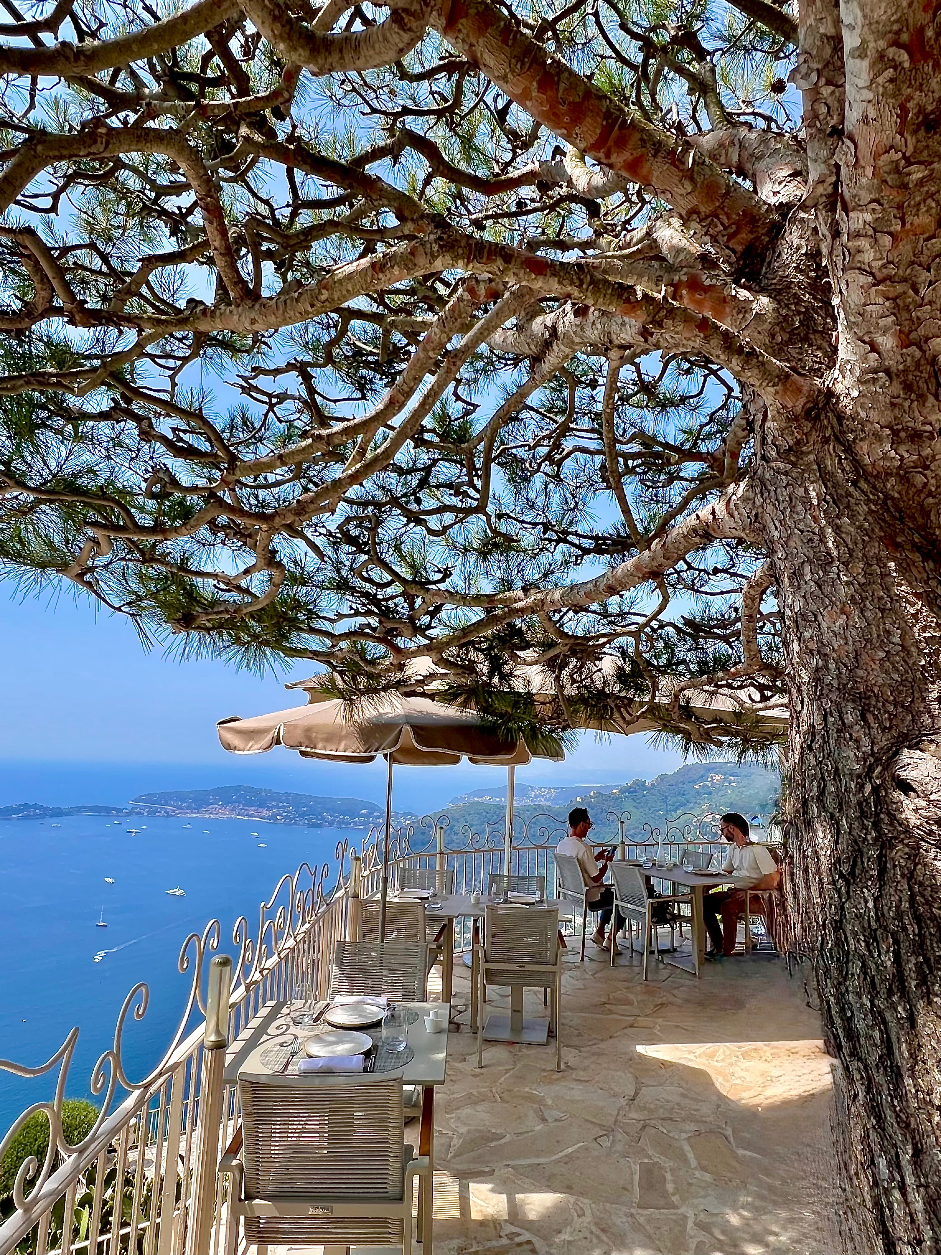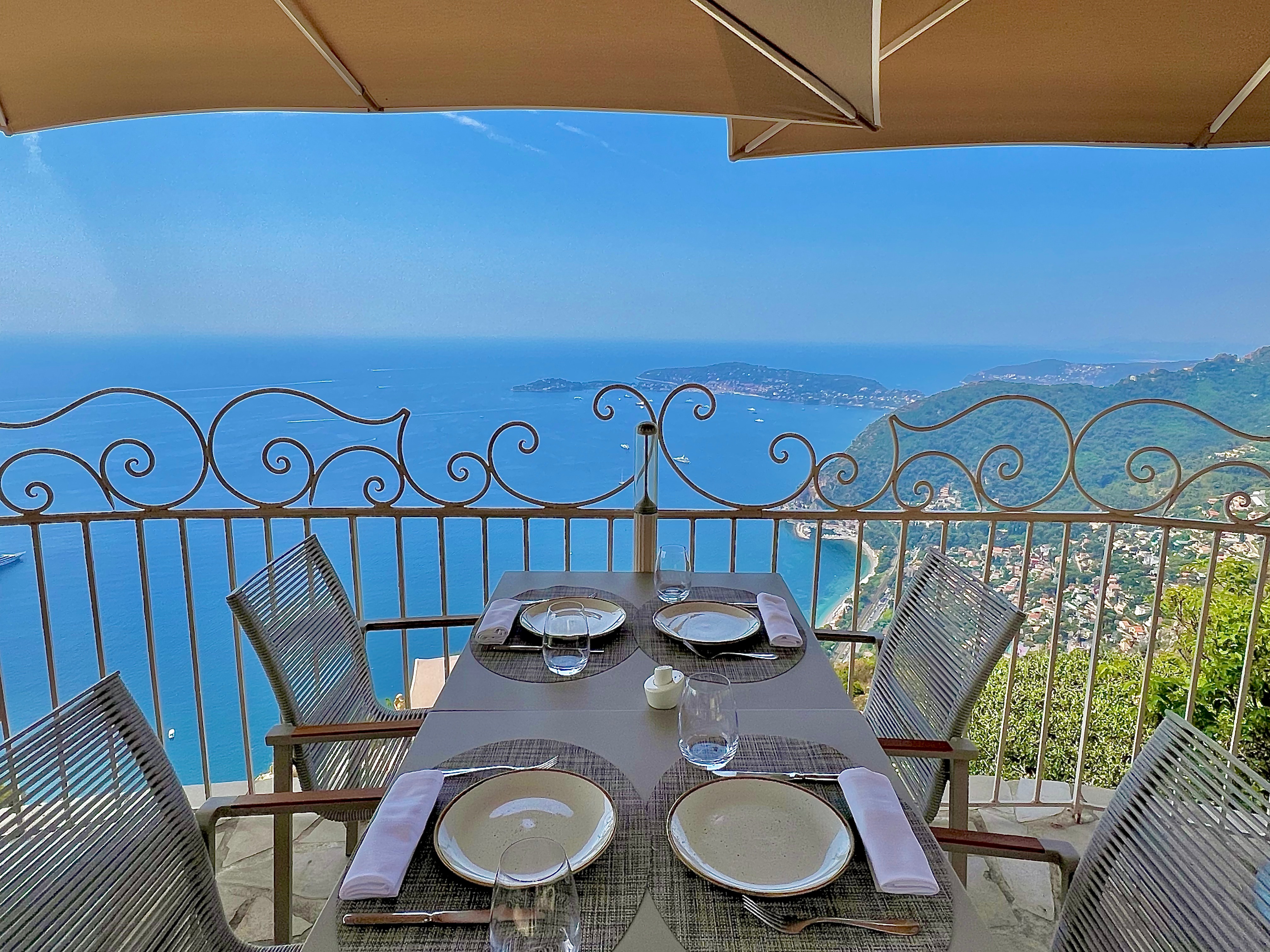 L’accès est toujours un moment émouvant, de ce contraste entre le tumulte touristique de ce village emblématique et la sérénité et l’élégance de cette mythique Chèvre. Après le passage par les jardins en restanques et quelques marches descendues, l’établissement se montre sous un autre jour, dans ses moindres détails. Vous entrez dans le cœur de ce lieu unique et tant prisé à travers le monde, vous comprenez alors tout ! De ces sculptures au classicisme rassurant, comme cette naïade couchée admirant avec romantisme la vue, de cette fontaine à clocheton, de cette piscine arrondie au style rétro, de ces toits aux tuiles se contrastant de l’intense bleu du ciel et de la mer (ou est-ce de la mer et du ciel ?), l’horizon est juste infini et vous voilà conquis par tant de beauté. Une pancarte fléchée vous rappelle votre destination : Le Café du Jardin. Vous passez devant cette cuisine ouverte telle une cabane des plaisirs gourmands, le Chef Tom Meyer et ses équipes vous saluent avec douceur et cet œil pétillant qui vous dit « heureux de vous recevoir ». C’est Oussama Azougarh qui vous accueille avec grande chaleur, sympathie et distinction. Il partage avec vous son plaisir d’être là, pour vous, dans ce cadre idyllique et presque secret. La vue est évidemment spectaculaire et offre une autre perspective de la nature environnante et du village. Tout est fait pour que vous vous sentiez à l’aise, chez vous, dans la décontraction d’une « summer-house ».