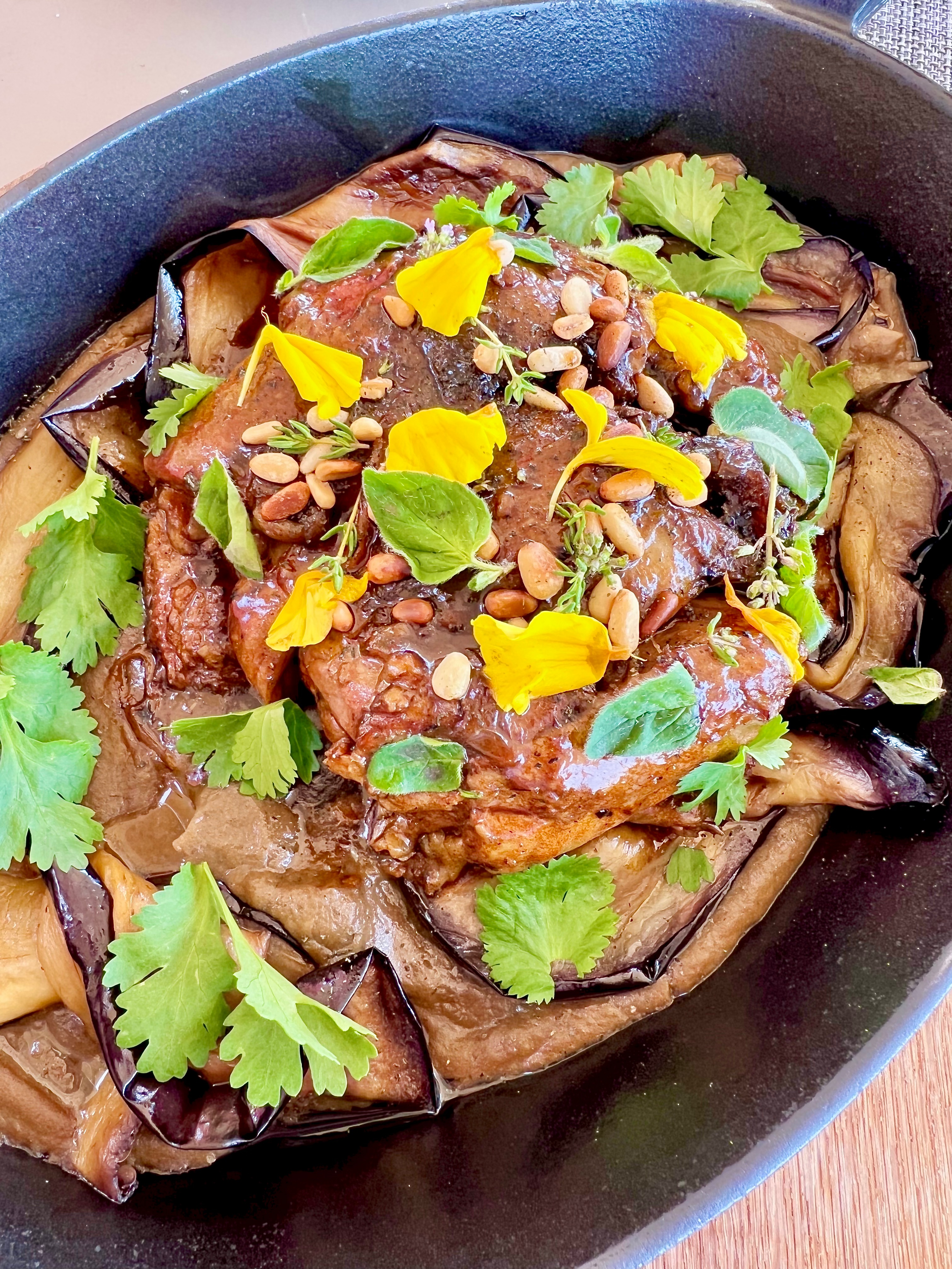 Épaule d’agneau confite, caviar d’aubergine à l’ail noir : cet agneau de lait de Sisteron est cuit en douceur durant 7 heures, il se confit et se nourrit de lui-même, de ses sucs et de son gras excellent et délicat qui délivrent une saveur incomparable, tel un « pulled lamb ». Le caviar d’aubergine est à la fois sauce et condiment crémeux d’une suave profondeur à la saveur finement fumée de l’ail noir. Les pignons de pin sont le croque-en-bouche judicieux de ce monde confit, compoté. Le thym vient attiser de sa fraîcheur de garrigue et la coriandre de son instance orientaliste assumée et bien vue.
