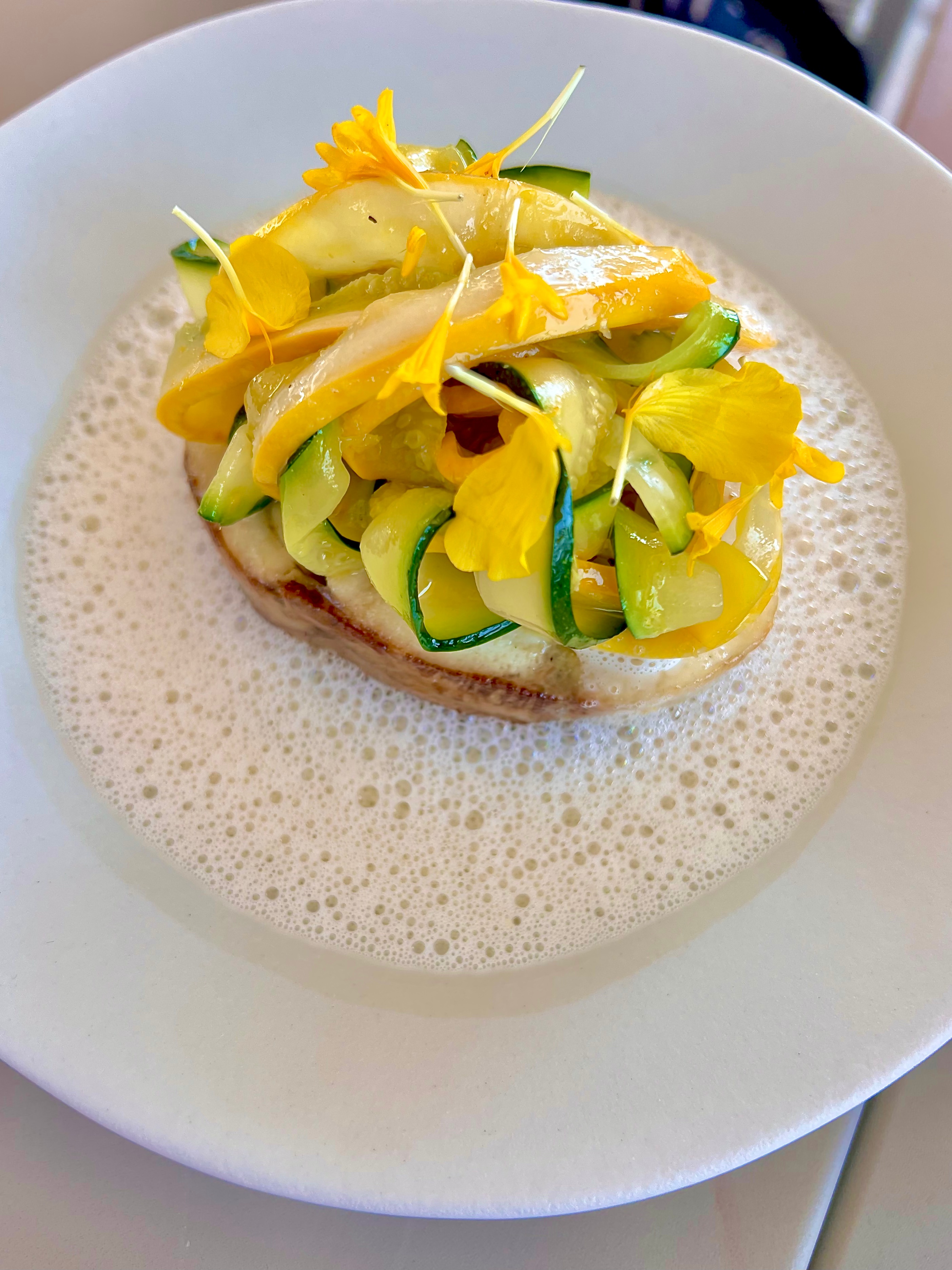 Le Maigre de Méditerranée, tagliatelles de courgettes, crème basilic, sauce anisée : travaillé en une ballotine, ce fin poisson d’une chair tendue est cuit de sa belle cuisson vapeur. Il s’imprègne de plaisir de l’aérienne émulsion de fumet de poisson ravivé d’anis. Les courgettes jaunes et vertes, en volutes de tagliatelles sur le dessus, dispensent une note de légèreté et de fraîcheur potagère à la pointe citronnée.