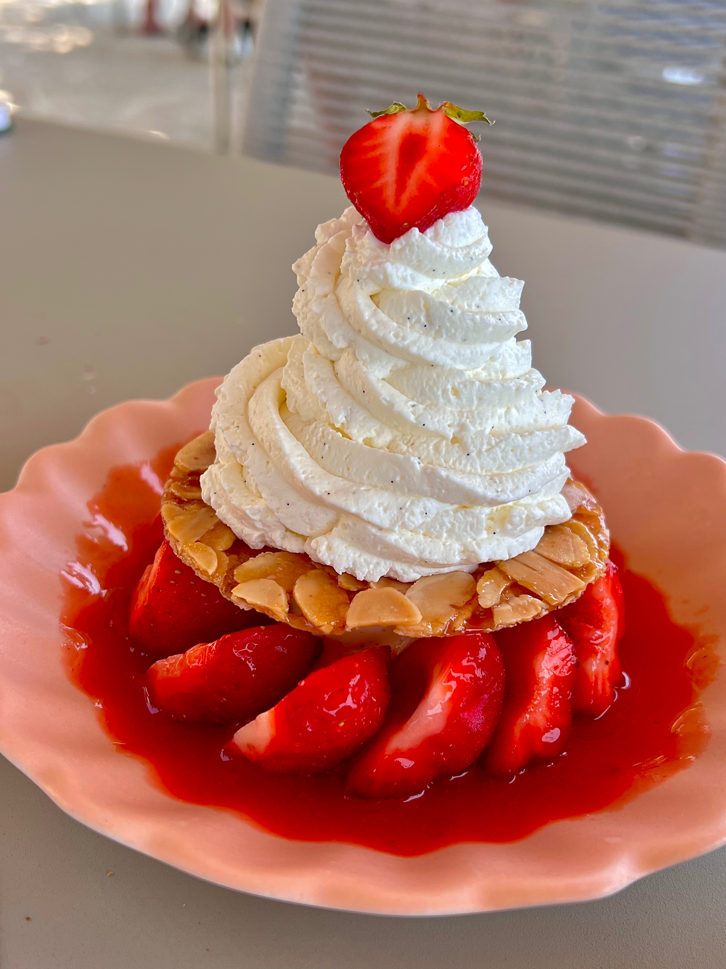Florent Margaillan, prodige des douceurs, est le Chef Pâtissier de La Chèvre d’Or depuis 2023. Pour Le Café du Jardin, il joue sur la fraîcheur estivale et les souvenirs de l’enfance, comme avec cette très légère et subtile Coco givrée, citron vert, elle cache en sa coque des strates de textures comme cette gelée vive de citron ou ce palet breton en croustille. La cuillère plonge intensément avec frénésie dans cette coco givrée qui se fait véritable dessert. La Fraise Melba, elle aussi, attise les appétits et les attentions de la tablée. Ces fraises de Carros à la succrosité gorgée de vie en morceaux et en sauce s’encanaillent de cette authentique et intense chantilly à la vanille. Le mendiant au centre intervient tel un fédérateur qui délivre l’intense plaisir.