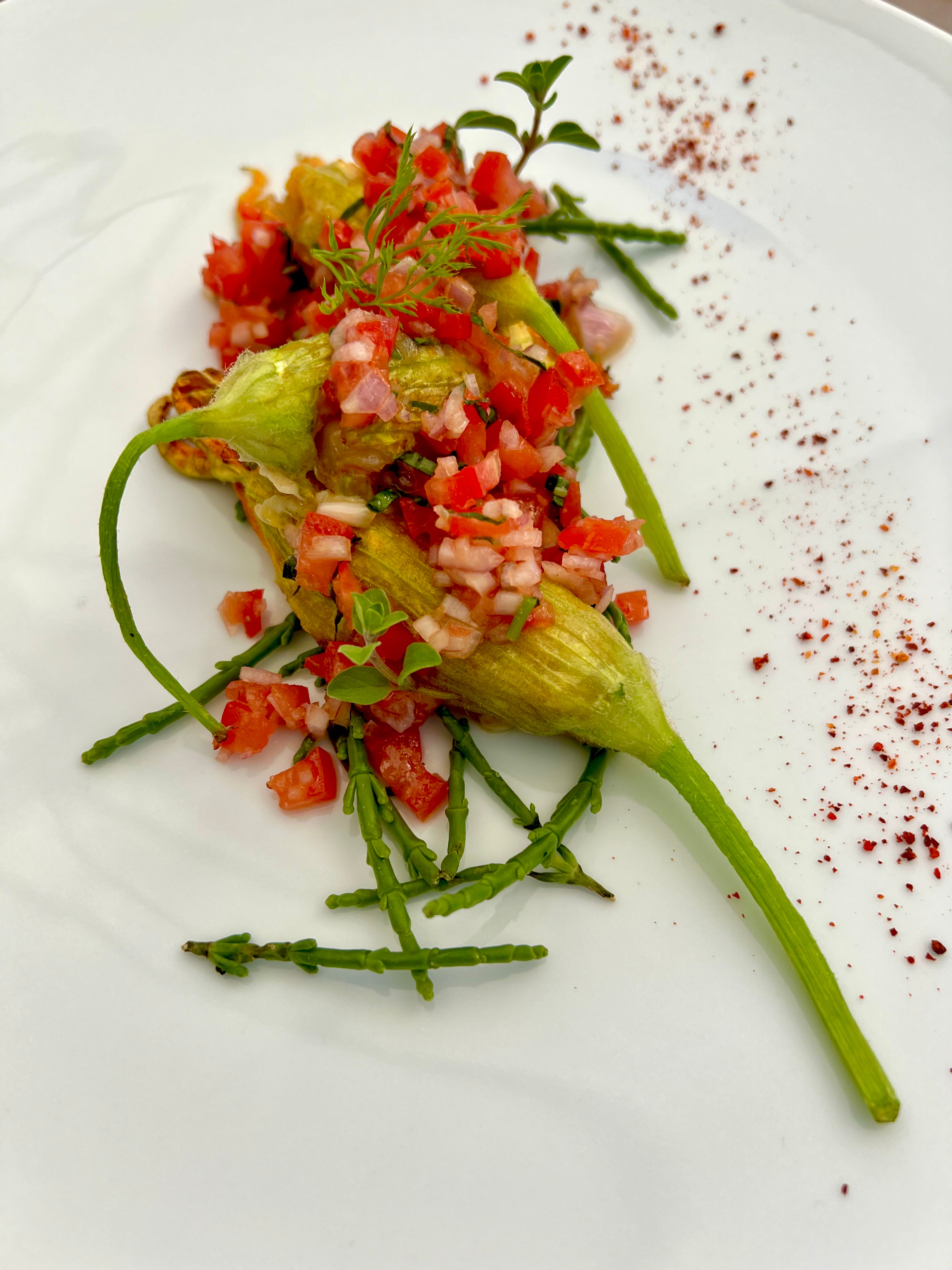 Fleurs de courgettes farcies rouget et salicorne : grande subtilité de ces fleurs cuites en délicatesse de la vapeur, qui cachent en leurs cœurs une farce fine de rouget donnant de sa personne. La salicorne vient instiller le croquant iodé et la vierge titille de sa pointe citronnée.