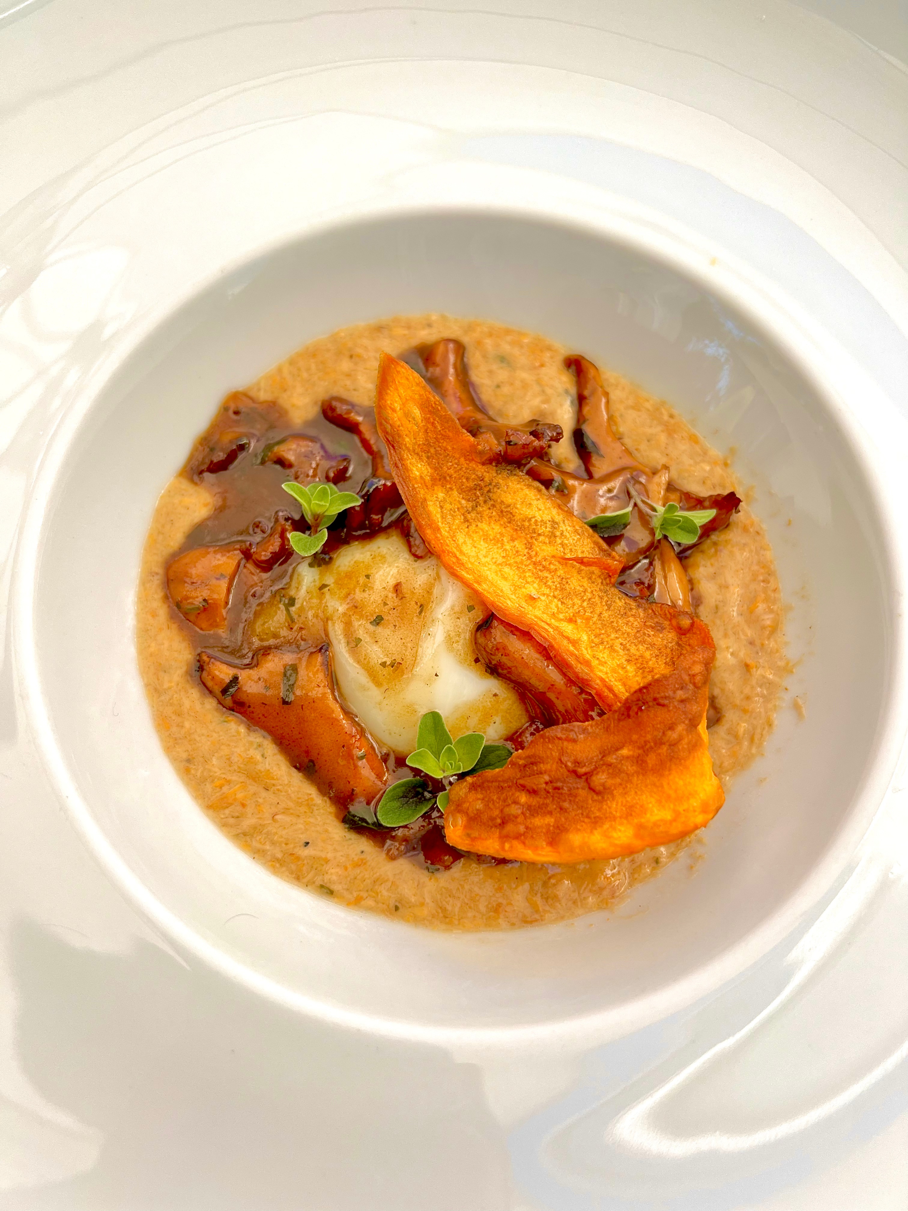 L’Œuf parfait aux girolles séduit avec malice de toute sa gourmandise assumée du jaune coulant de plaisirs sur ces girolles en deux façons : parfaitement sautées entières et en douce purée. Le jus de viande concentré enveloppe ce monde avec concentration et sensualité.