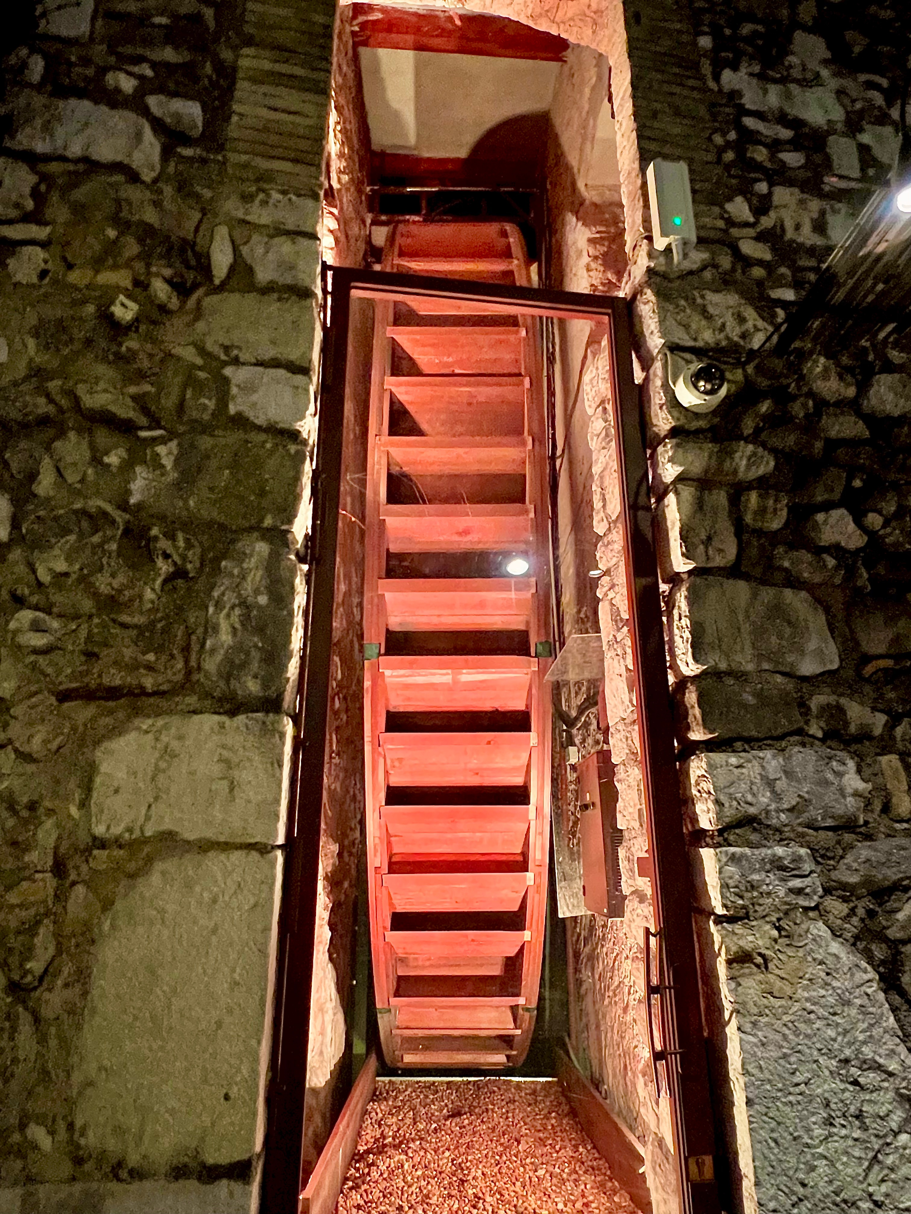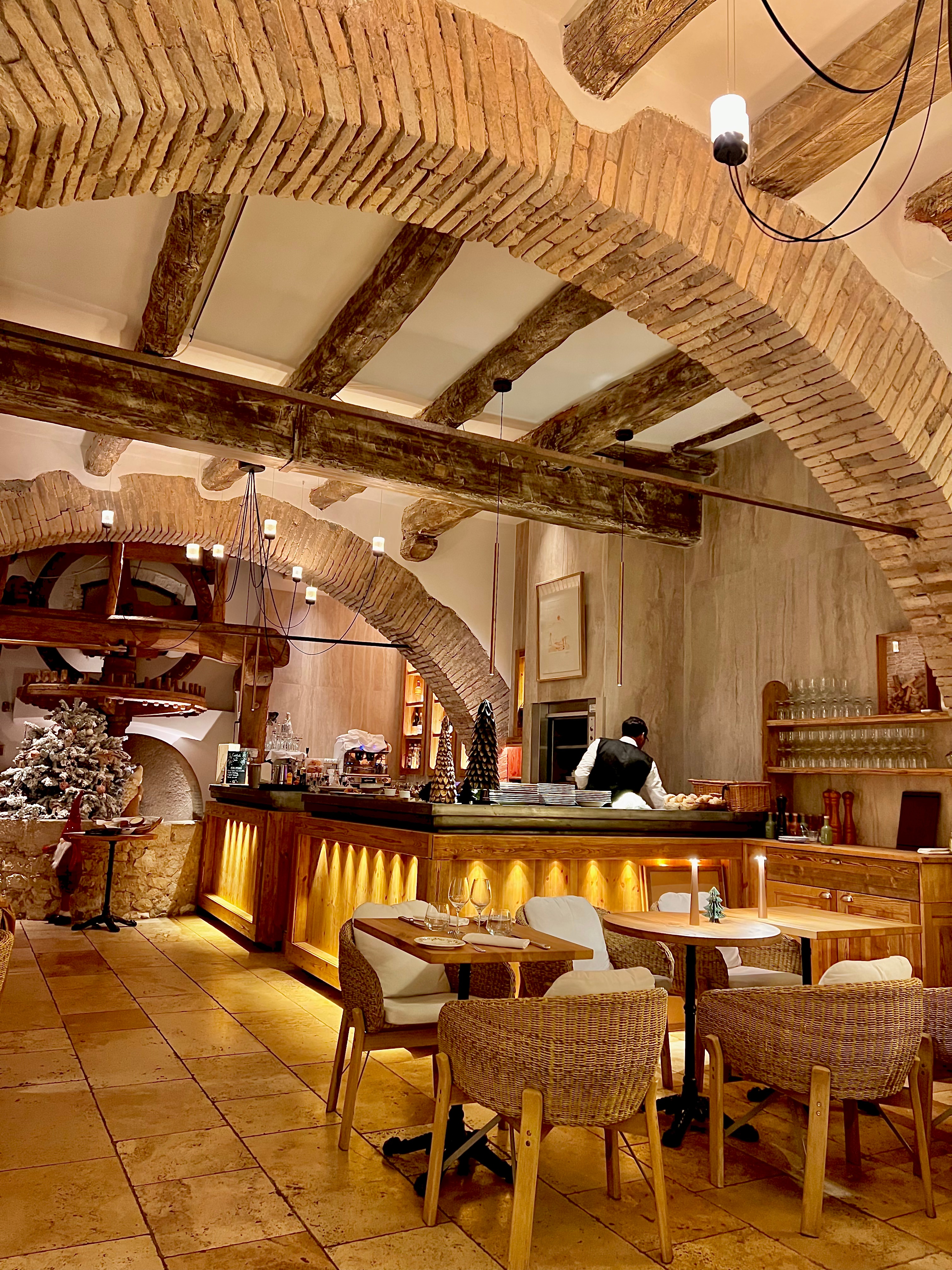 Dans ce lieu, la salle se fait chaleureuse, aux point de lumières raffinés, d’une décoration mêlant le rustique-chic du bois blond et la noblesse de la belle pierre aux lignes actuelles, le tout est rythmé d’oeuvres d’art avec un soucis du détail (à part peut-être l’horloge numérique à tubes Nixie qui brouille l’attention, tel un écran, et délivre un anachronisme et une notion du temps peu souhaitée dans un restaurant).