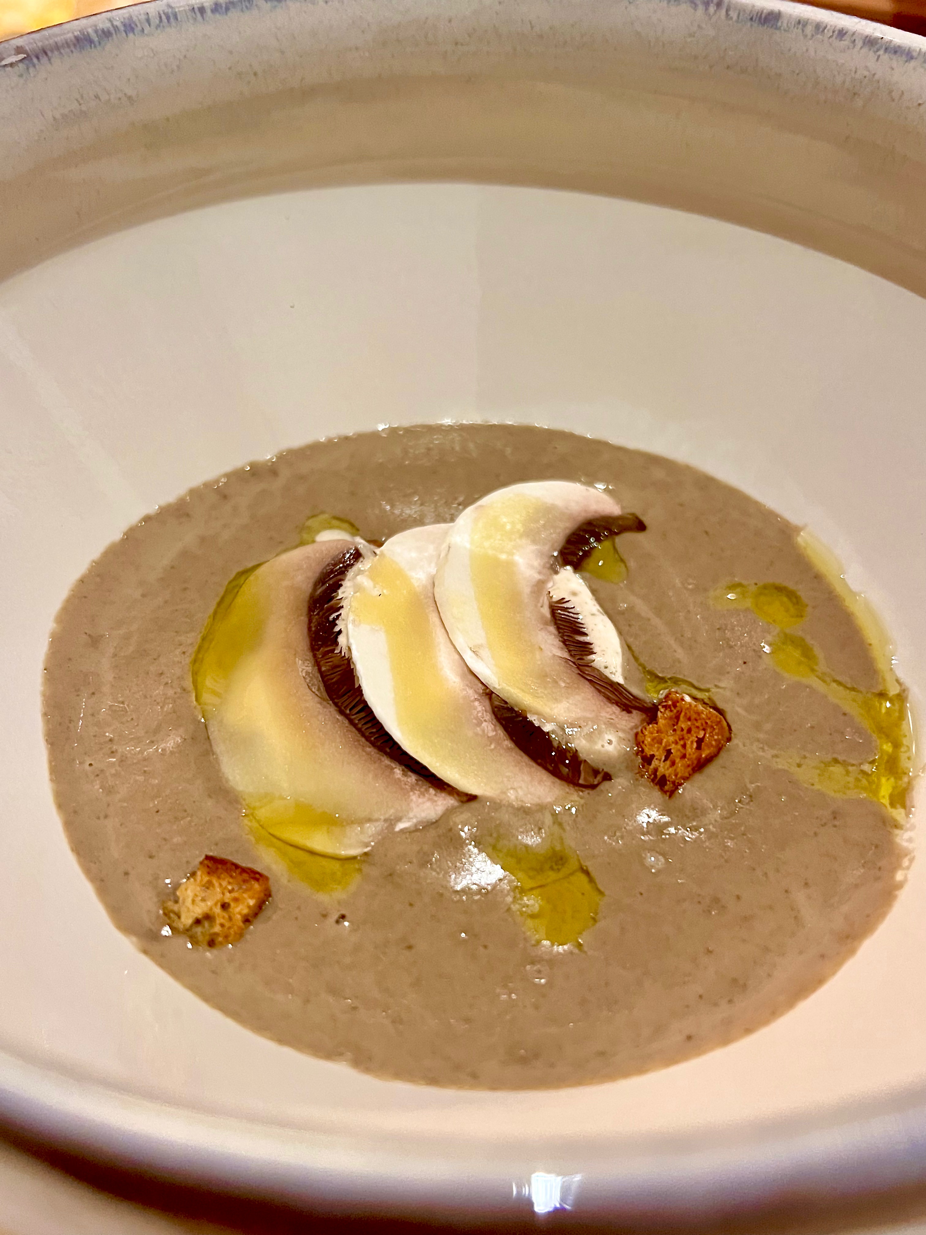 Puis, en pré-entrée, la Crème de champignons et cappuccino de cèpes vous plonge directement dans les plaisirs gourmands des réconfortantes soupes des débuts de repas de famille. D’une texture velourée et aérienne, cette crème offre une savoureuse chaleur du sous-bois, sublimée par l’élégance d’un cappuccino de cèpes. Les fines tranches de champignons de Paris apportent la claque et les croûtons bien dorés la croustillance. On ressent alors cette envie incontrôlable et enfantine de tendre son bol pour en avoir encore.
