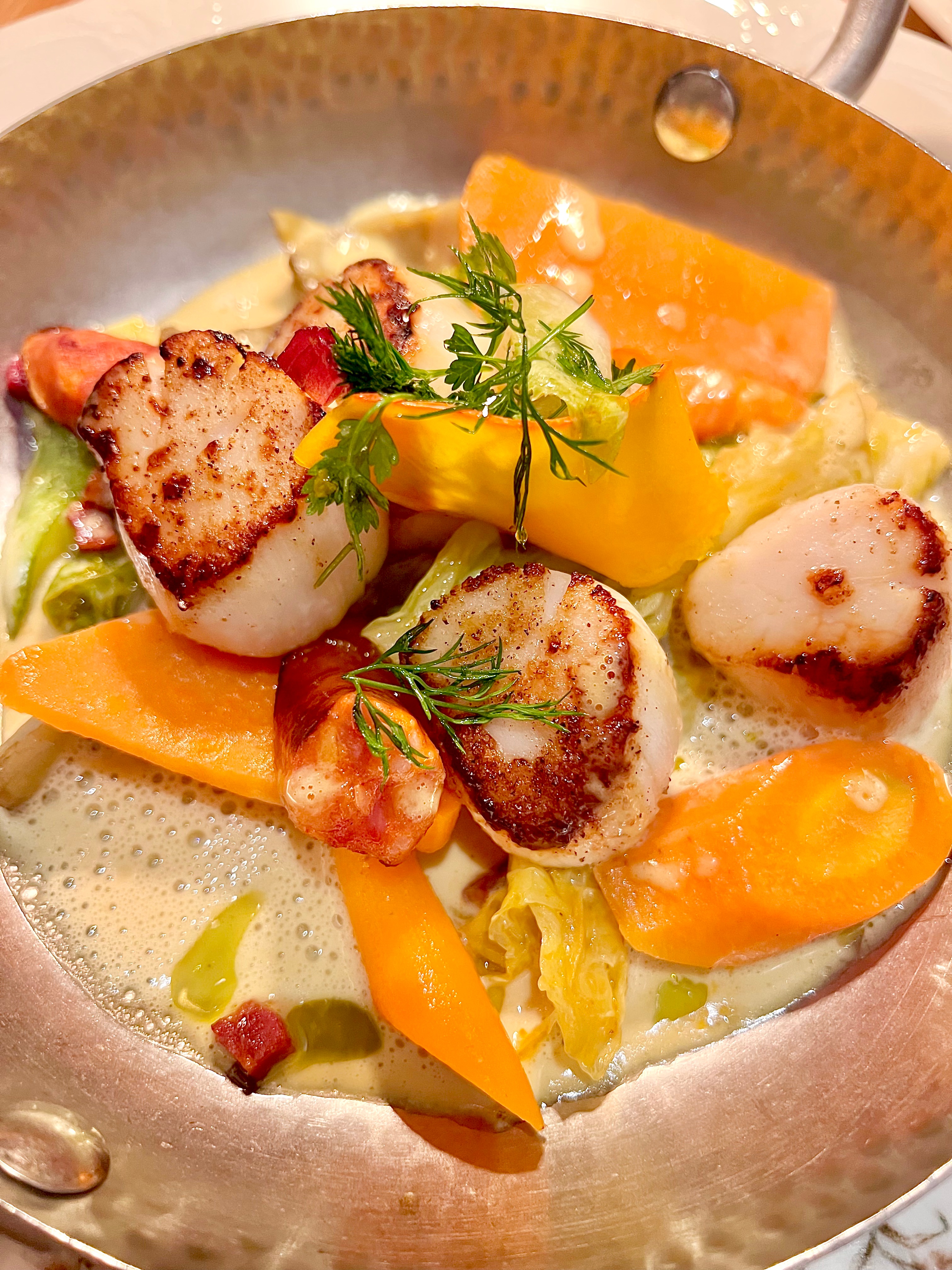 Cassolette de coquilles Saint-Jacques, artichauts, chou frisé et chistorra : le plaisir est bien là dans cette élégante cassolette, faussement classique, de ces Saint-Jacques snackées-nacrées en perfection. Elles s’enrobent d’une séduisante sauce beurre blanc, travaillée en fine émulsion contemporaine. Le chou frisé, doucement braisé, apporte une respiration végétale ponctuée d’une délicate amertume, rythmant la dégustation. La chistorra, libérant çà et là ses notes fumées et épicées, vient réveiller l’ensemble et signer le plat d’une gourmandise affirmée.