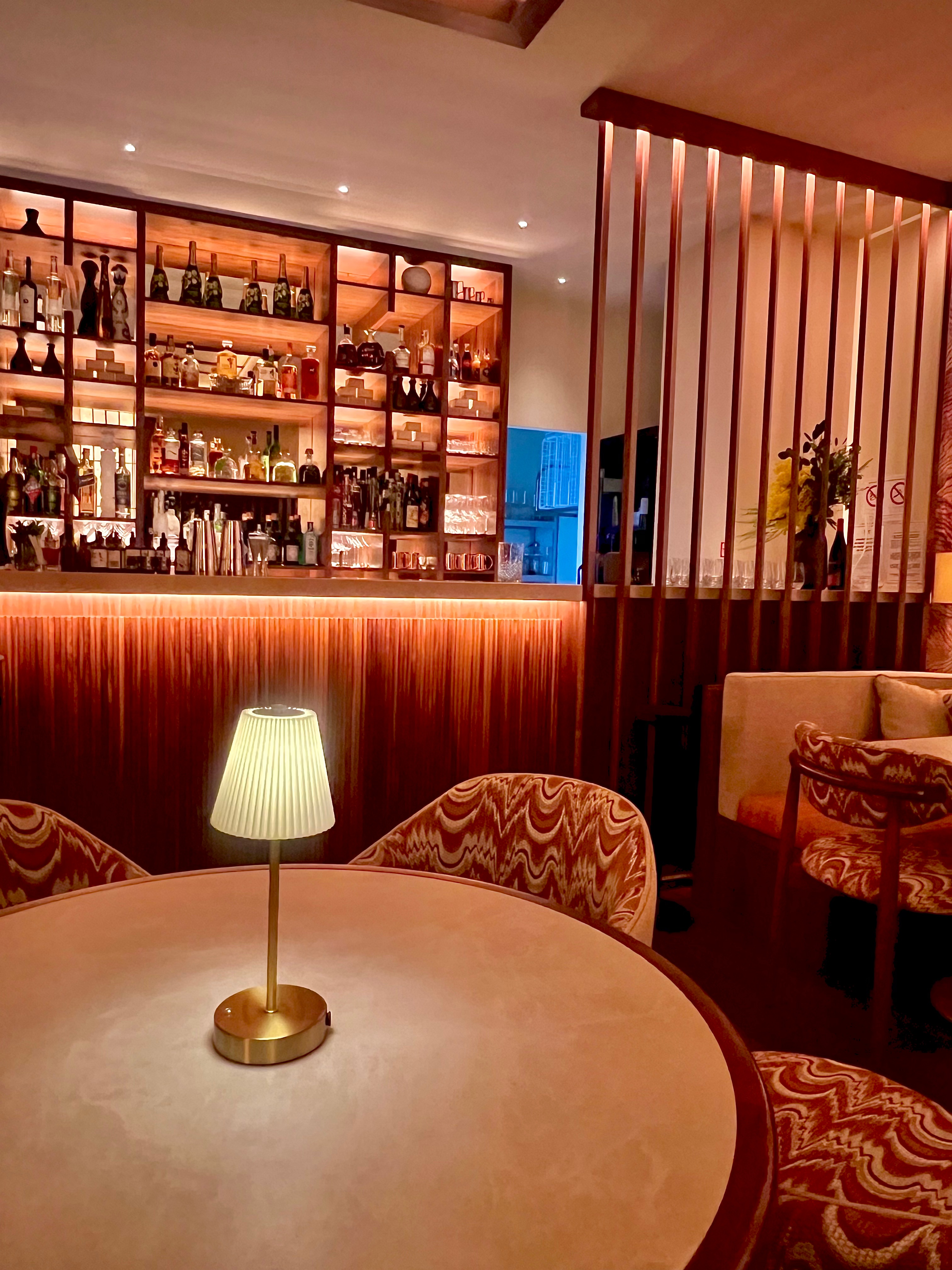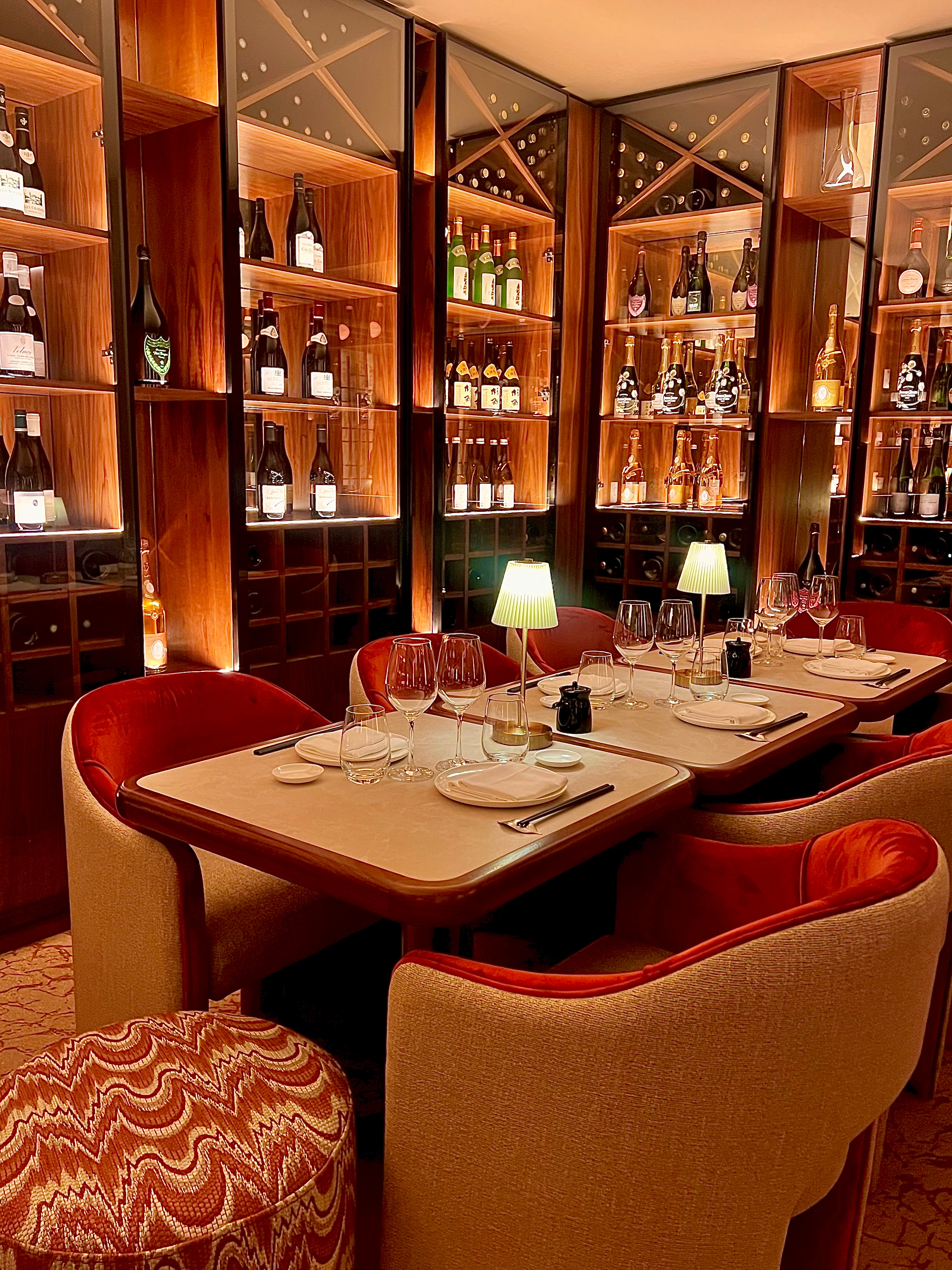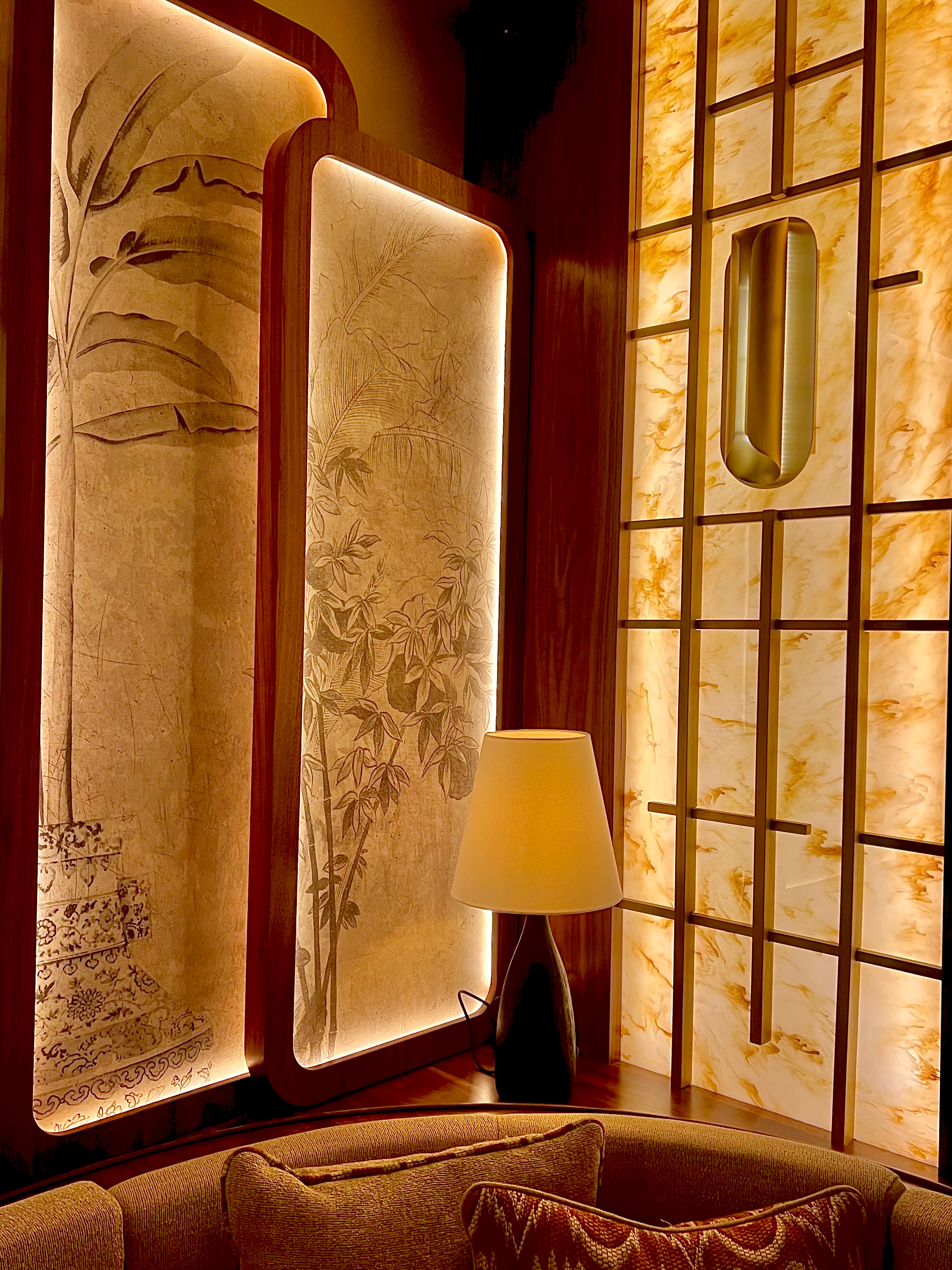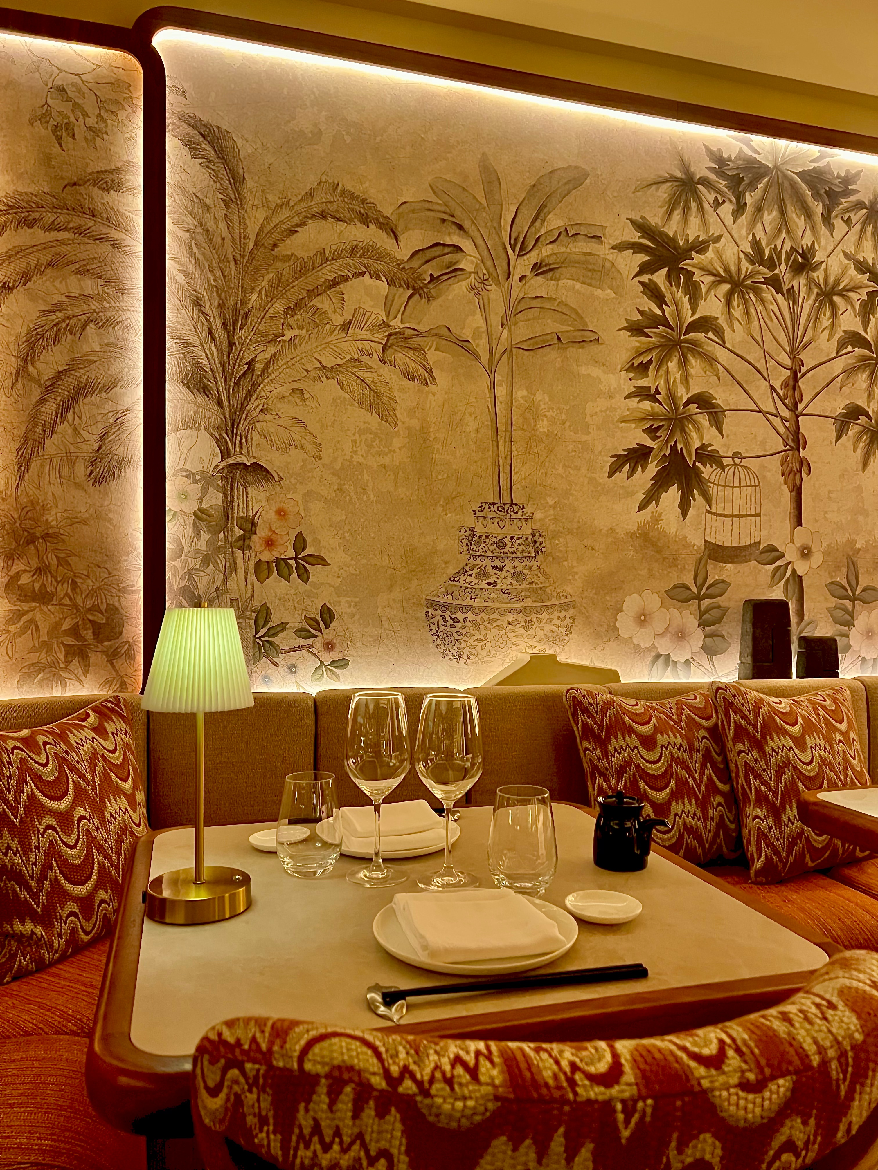 La décoration, signée du designer cannois Samy Chams (La Guérite Cannes, Jimmy’z Monaco, Bagatelle Courchevel, Shelona St Barth et Queen Miami Beach), est racée, intime et feutrée, dans un style rétro chic exotique. Les matériaux sont cossus et charnels, aux influences mid-century : miroirs ciselés, bois brun profond, laiton patiné, tissus aux impressions brocart. Le tout est sublimé par une lumière tamisée, évolutive, tout comme l’ambiance au fil des soirées du week-end avec un DJ set, créant ainsi une atmosphère sensuelle et incarnée.