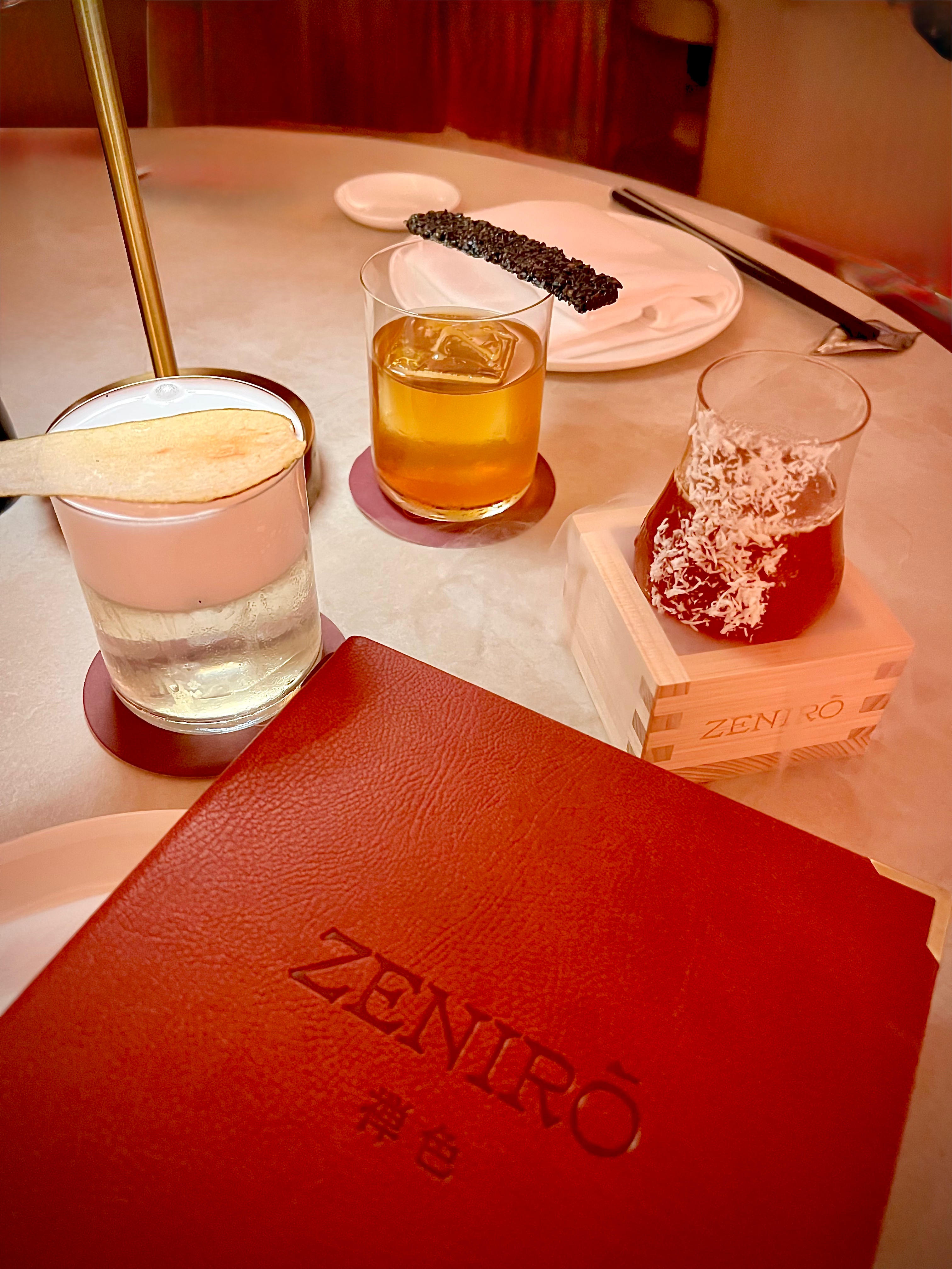 Tout débute avec excellence et raffinement par les cocktails signés Jimmy Sénéchal (ancien chef barman de l’Hôtel Belles Rives et de l’Hôtel Les Roches Blanches), qui sont d’une précision rare et d’une infinie subtilité. Chacune de ses créations vous fait entrer dans le monde réel et non modeux de la mixologie, comme le Sumi (Hennessy VS, Dom Benedictine, Antica Formula, coco torréfié), l’Ansho (Whisky Suntory Toki, Fernet Branca, sésame grillé, agave, réglisse) ou l’Ennetsu (Tequila Patron Silver, aji amarillo, Genepi, sencha, huile piquante au sésame).