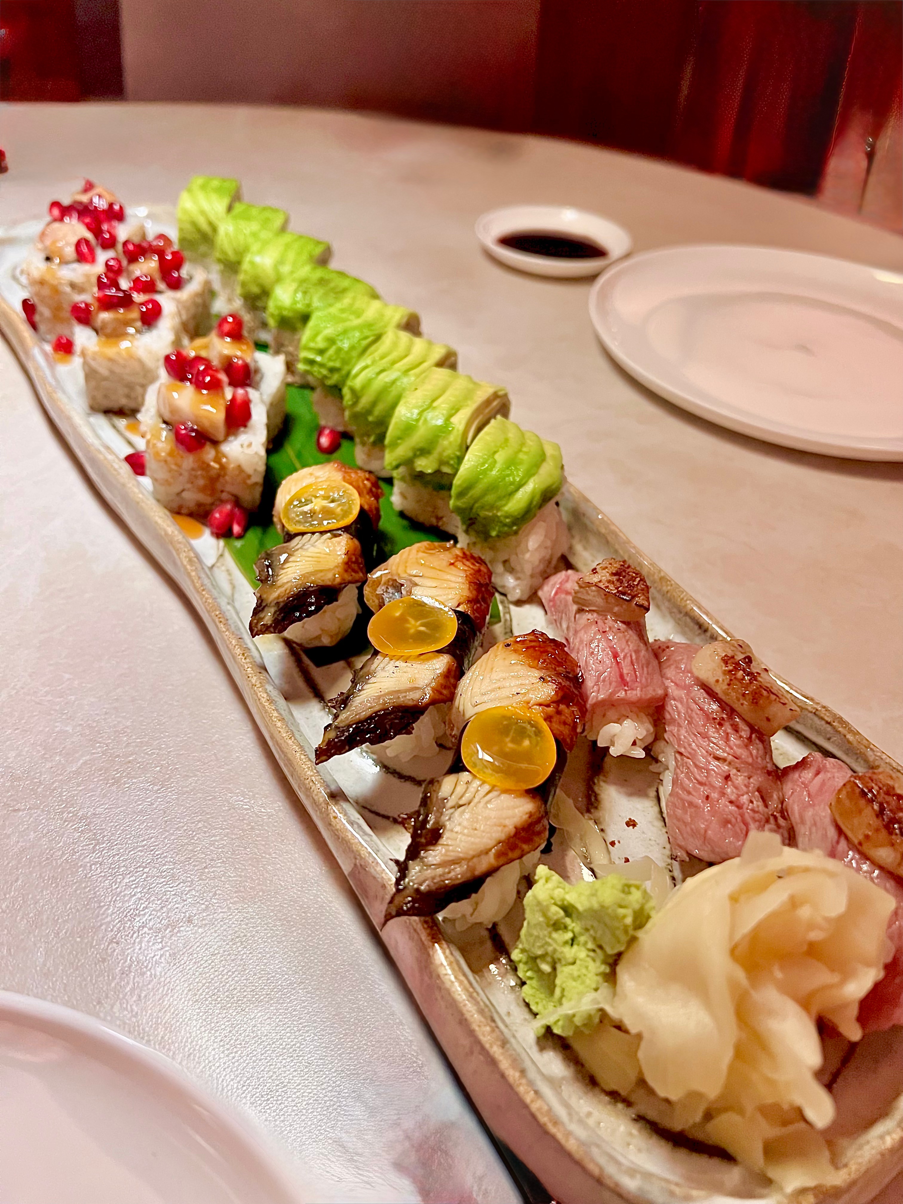 À la lecture de la carte, les nigiris et makis font joliment frétiller les papilles. Des associations pimpantes et pleines de promesses : nigiri unagi (anguille laquée), orange miso & kumquat ; Nigiri Wagyu, foie gras, huile de truffe & miso séché ; Maki soft-shell crab, concombre et avocat ; ou encore Maki Black cod & foie gras. Sur le papier, la partition semble prometteuse, mais à la dégustation, l’ensemble peine à véritablement décoller. Le riz, pourtant pilier absolu du sushi, n’est malheureusement pas au rendez-vous : assaisonnement imperceptible, texture un peu molle et température trop froide pour exprimer toute sa subtilité habituellement si troublante. Dans ces conditions, même les produits luxe ont du mal à jouer leur rôle. wagyu, foie gras, black cod… autant d’ingrédients puissants qui restent curieusement en retrait. Quant au soft-shell crab, attendu croustillant, il arrive imbibé et sans le relief espéré. Des compositions aux intitulés séduisants, mais qui, en bouche, manquent encore de cette précision et de cette vivacité qui font les grands sushis. Espérons qu’il ne s’agisse que d’un réajustement « technique » : un riz plus précis, une cuisson plus juste, un peu plus de chaleur et de croquant… et ces nigiris et makis pourraient alors pleinement révéler toute leur créativité et leur gourmandise si addictive.