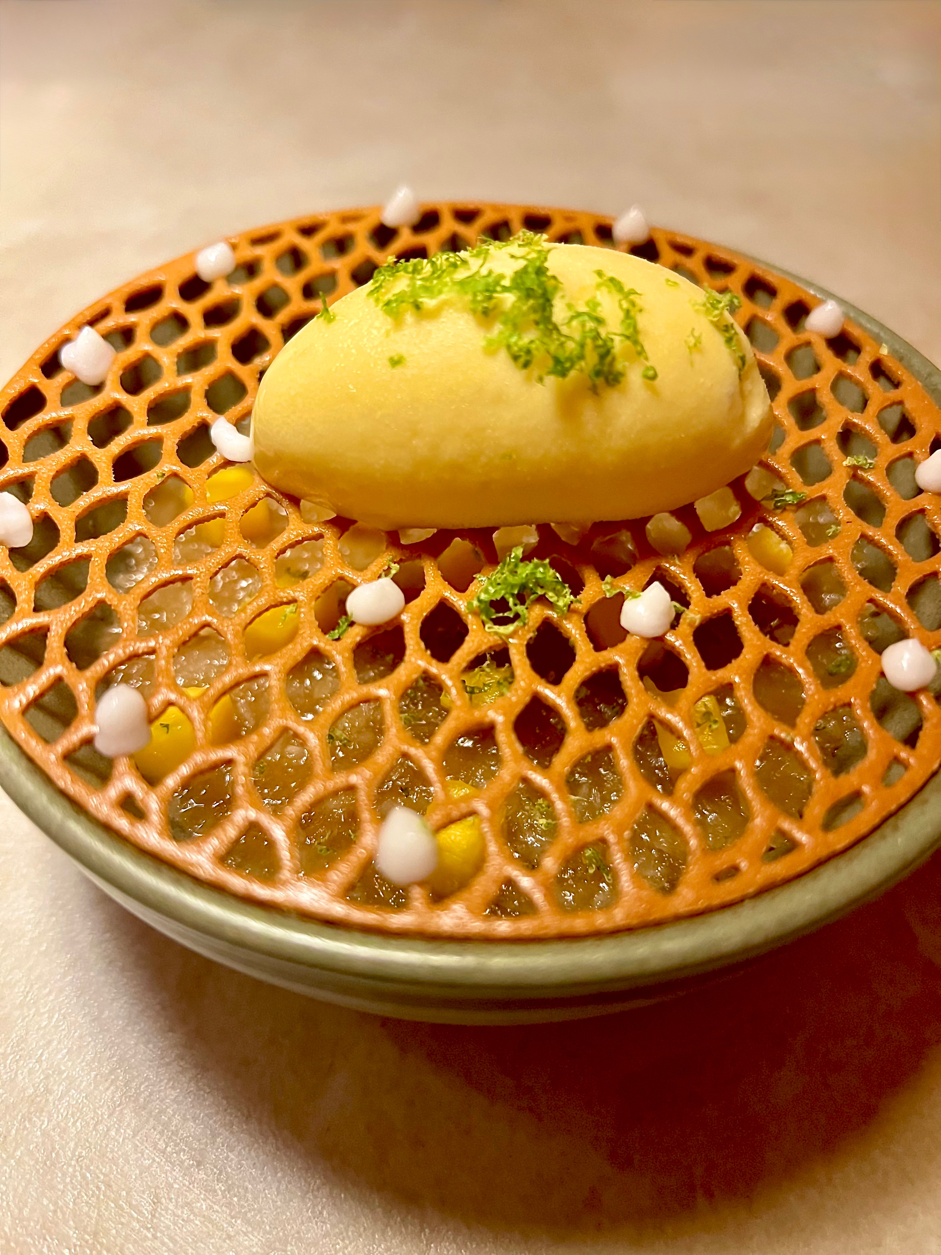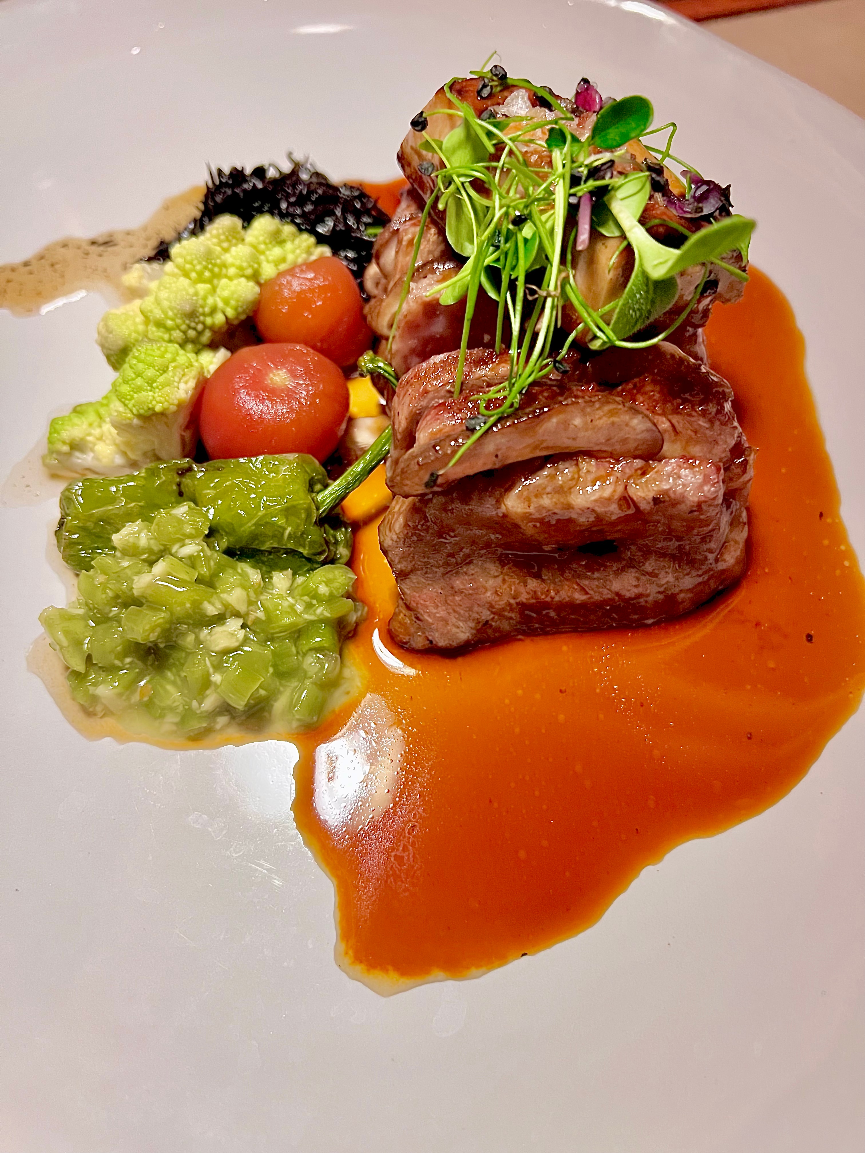 Le Filet de rouget, sauce sésame, salsa de riz : ce tendre rouget local se grille de la flamme avivée de la saveur du charbon binchotan qui lui confère un goût unique. La cuisson est sincère et laisse ce délicat poisson s’exprimer en parfait accord de la sauce sésame. Le riz, quant à lui, prend des airs dansants hispaniques de la salsa, une efficace touche des origines du chef.