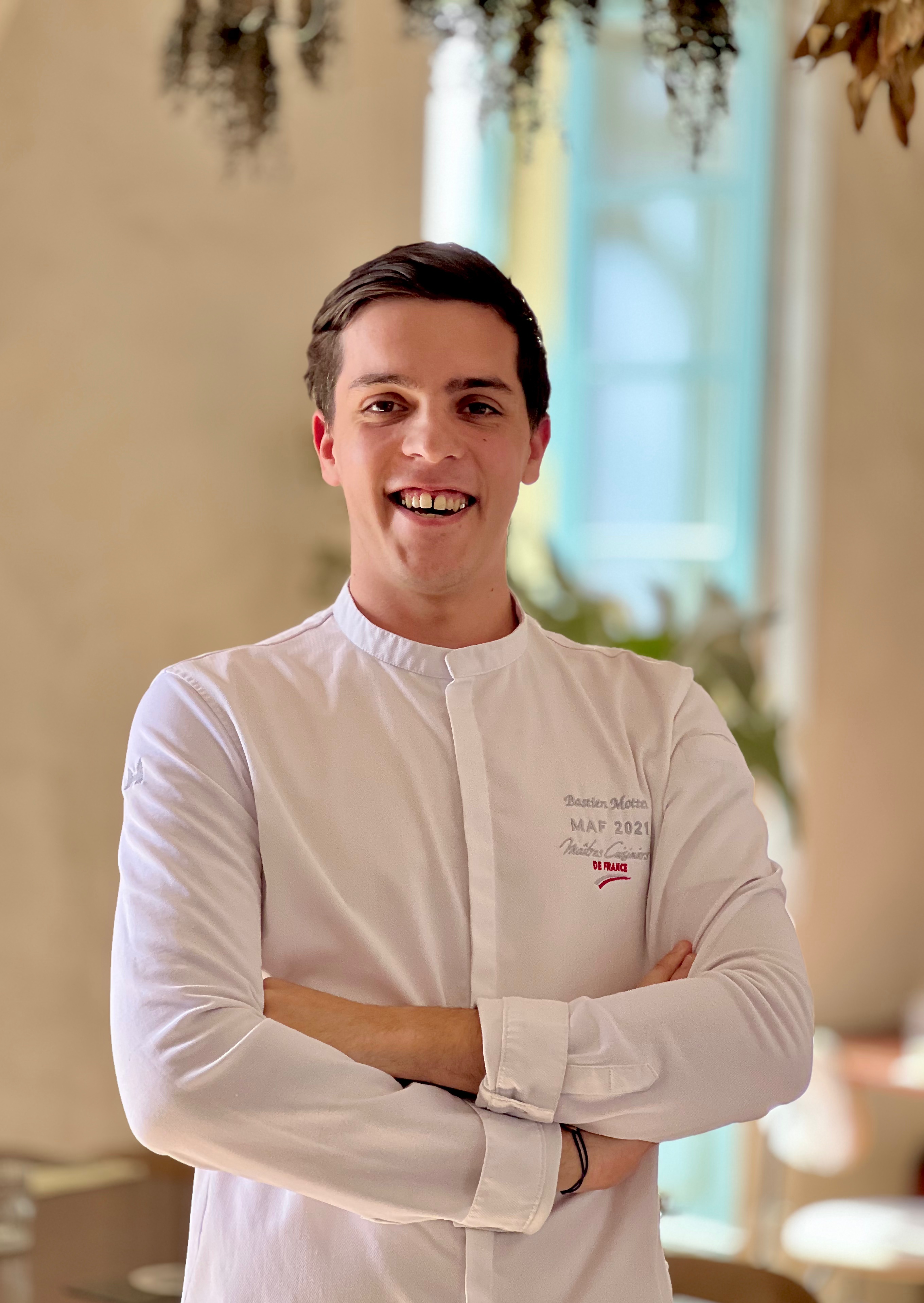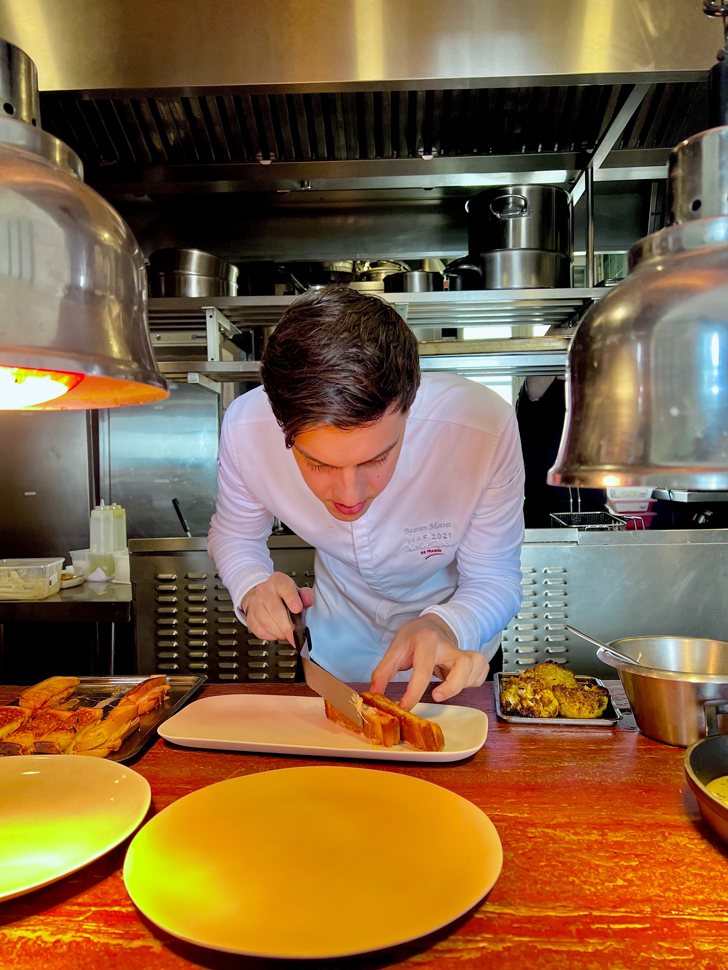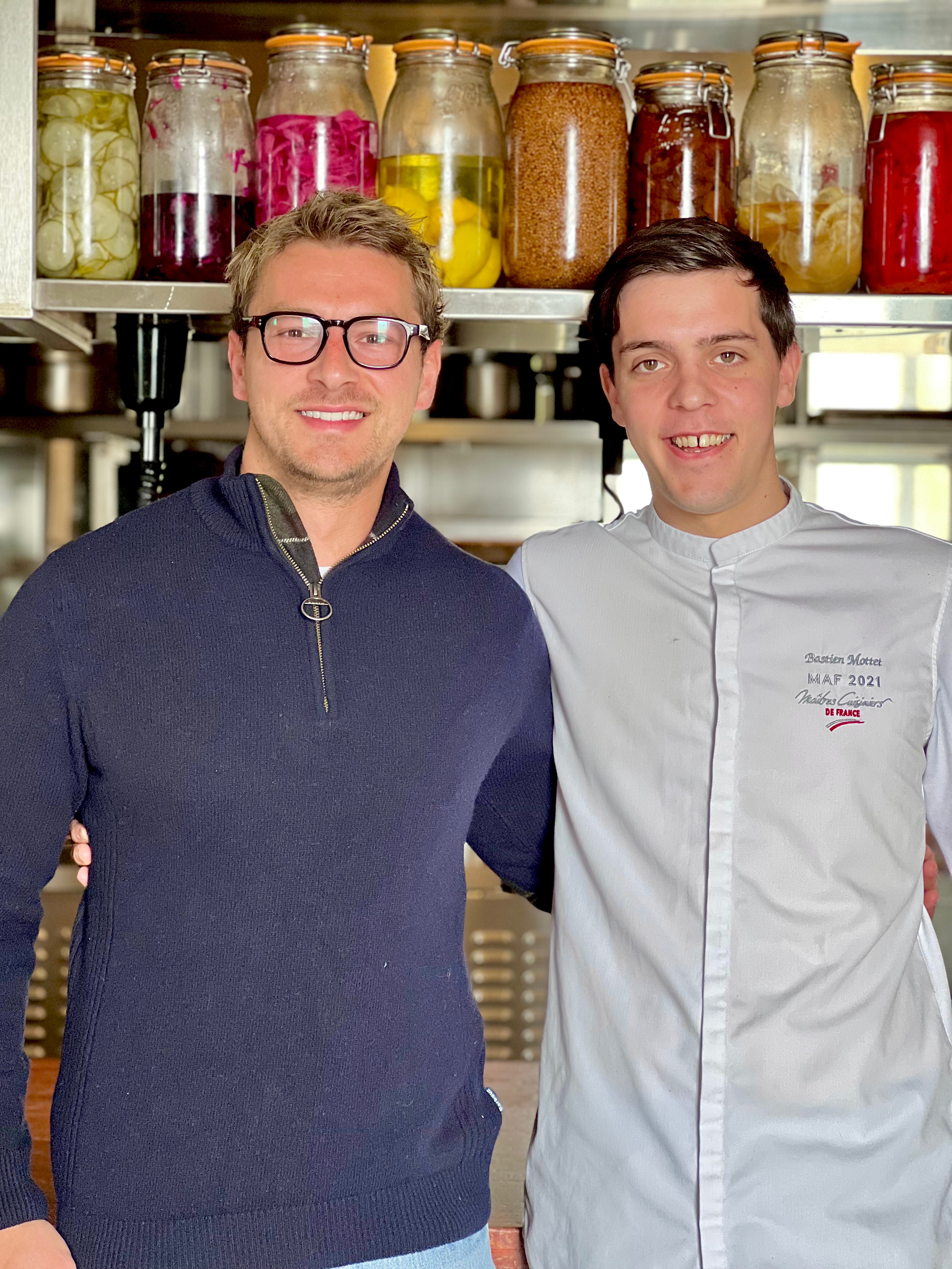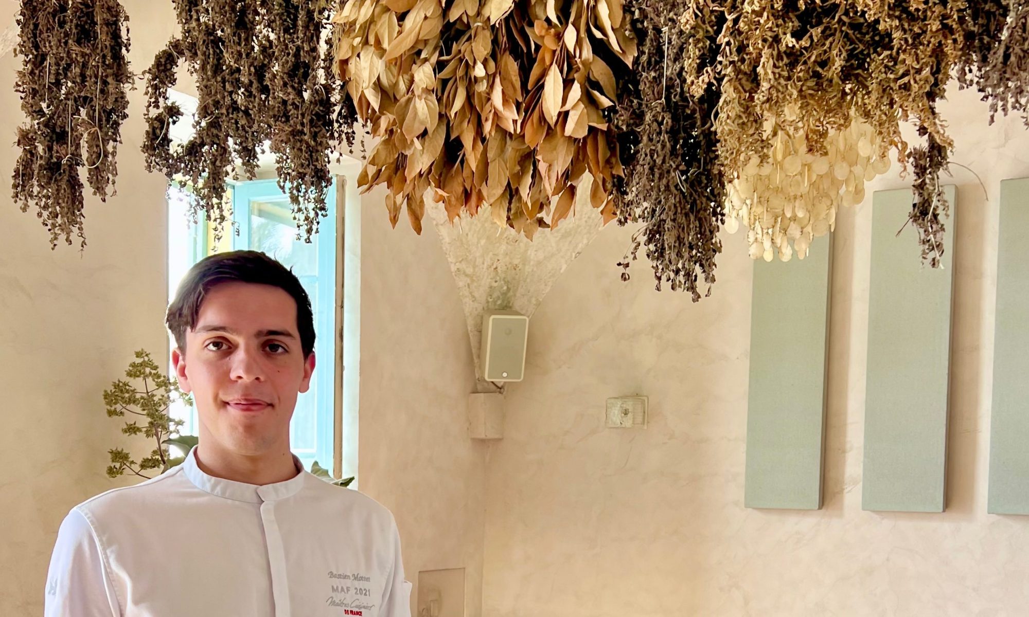 Jean-Baptiste, qui n’en est pas à son premier établissement, a géré plusieurs adresses parisiennes, entre bistrots logotés et belles brasseries. À ses côtés, le jeune chef Bastien affiche déjà un parcours bien trempé : du Domaine de Champlong au doublement étoilé Chapter One** du chef Mikaël Viljanen, en passant par le Statholdergaarden* avec le chef Bent Stiansen à Oslo . Sa rencontre, déterminante pour sa carrière, avec le talentueux chef Tom Meyer à Granite* marque un tournant. Bastien y débute comme chef de partie, avant de le suivre dans l’aventure de La Chèvre d’Or, où il gravit rapidement les échelons, passant en moins de deux ans de premier chef de partie à sous-chef. Animé par le goût du défi, il reçoit le prix de Meilleur Apprenti de France Espoir 2021 lors de ce prestigieux concours révélant les talents de demain. Il remporte également l’édition Grand Sud du Trophée Masse, sous la présidence de Fabien Ferré.