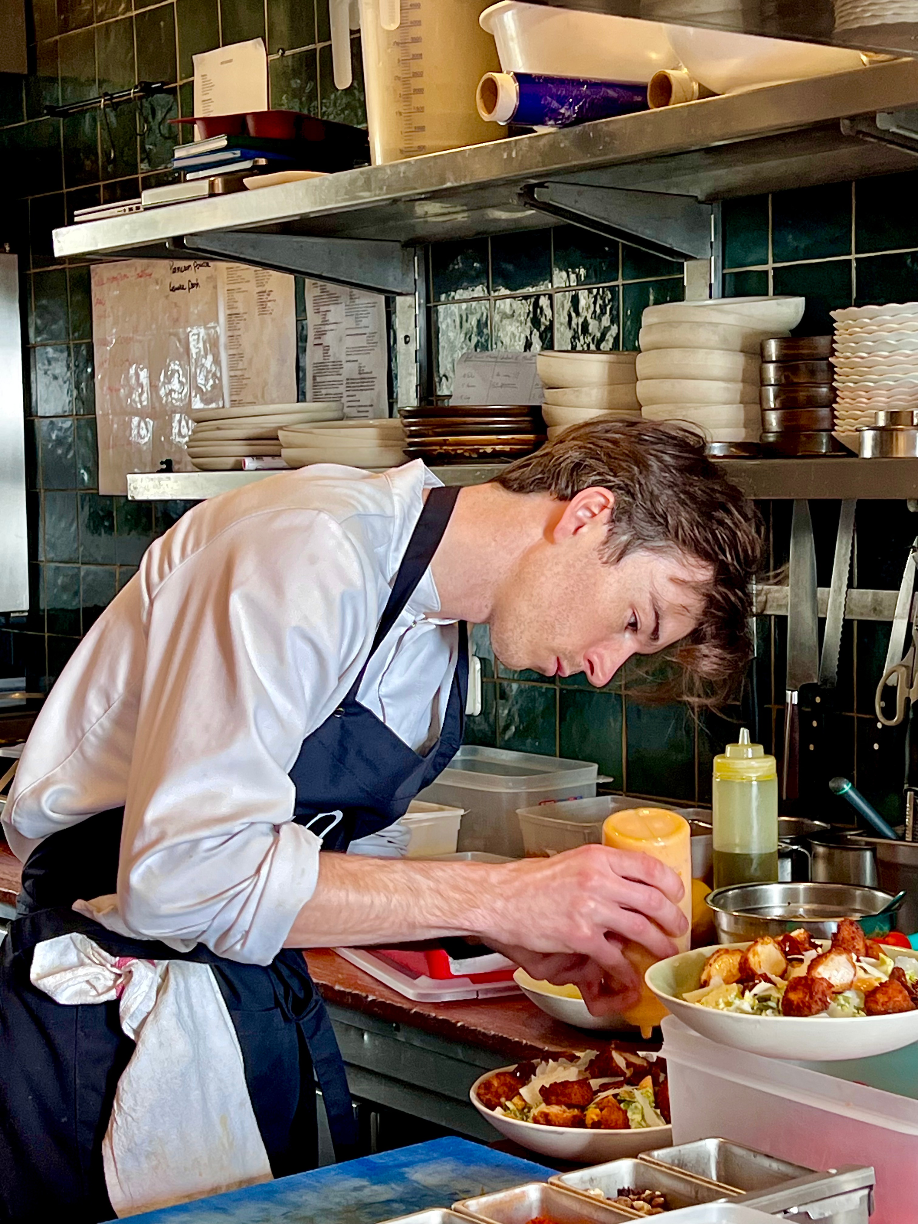 Chef passionné de son temps, il instille une technique et une profondeur actuelle : il prépare lui-même son miso, mature les viandes et travaille les sauces et jus avec force. Tout est pensé en amont avec perspicacité et efficacité pour le plaisir des sens. Il est épaulé par son chef sur place, Lilian Karras, qui était l’année dernière de La Chèvre d’Or, notamment au Côté Jardin.
