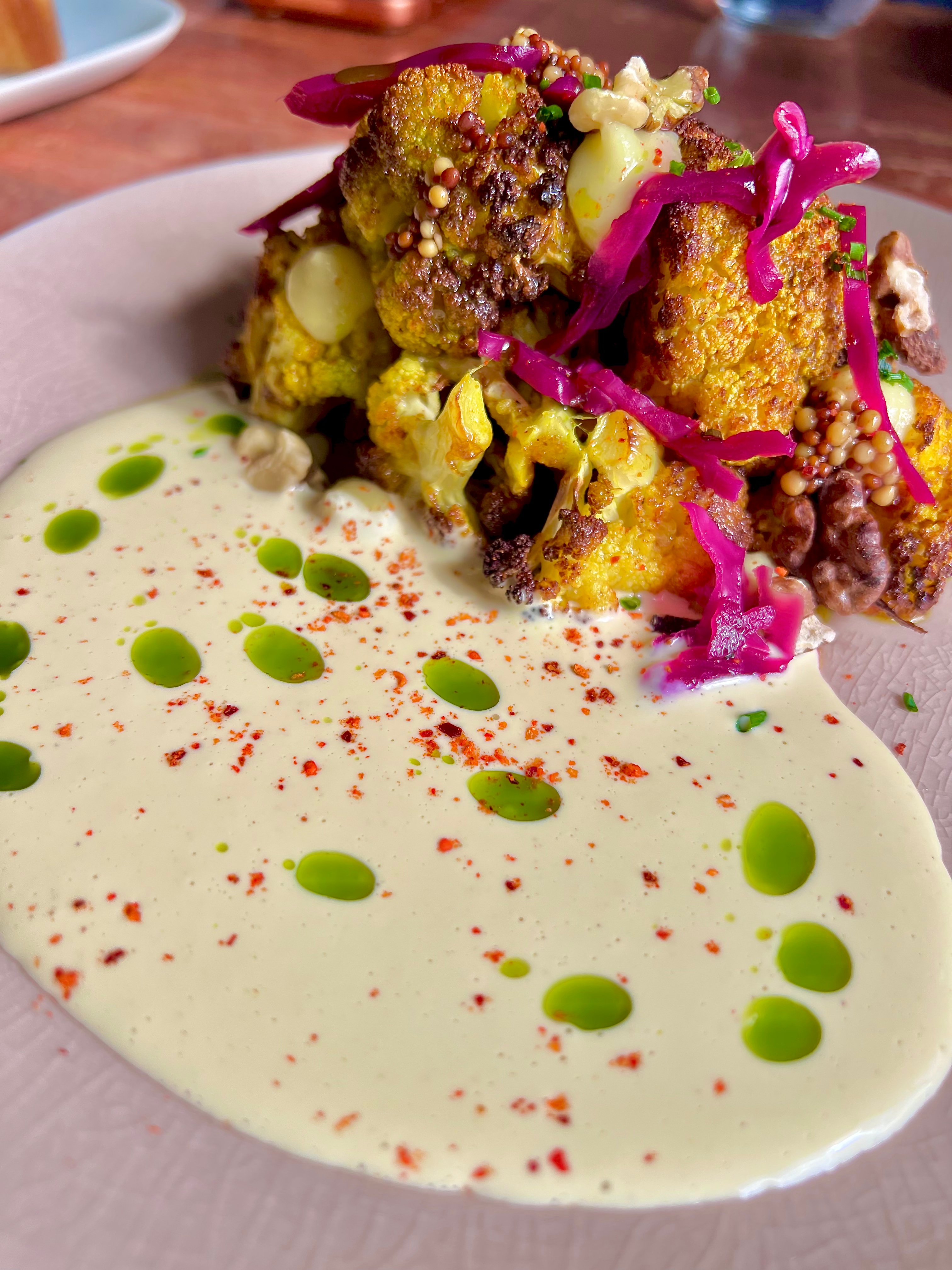 Le Chou-Fleur Rôti au Curry & Velours de Noix : cette généreuse demi-sphère de chou-fleur est tendrement rôtie au curry doux, elle se réhausse en complexité de saveurs, de textures et de coloris : des pimpants pickles de chou rouge et pickles de graines de moutarde blanches et brunes, de noix torréfiées et du condiment-gel de citron. Une véritable symphonie qui emporte ce chou-fleur dans une instance gastronomique vivante. Le velours de noix au vin jaune, précisément moutardé, est une sauce accompagnante et aimante de toute sa valeur. Le piment d’Espelette et l’huile d’herbes par touche discrètes apportent la rythmique nécéssaire.