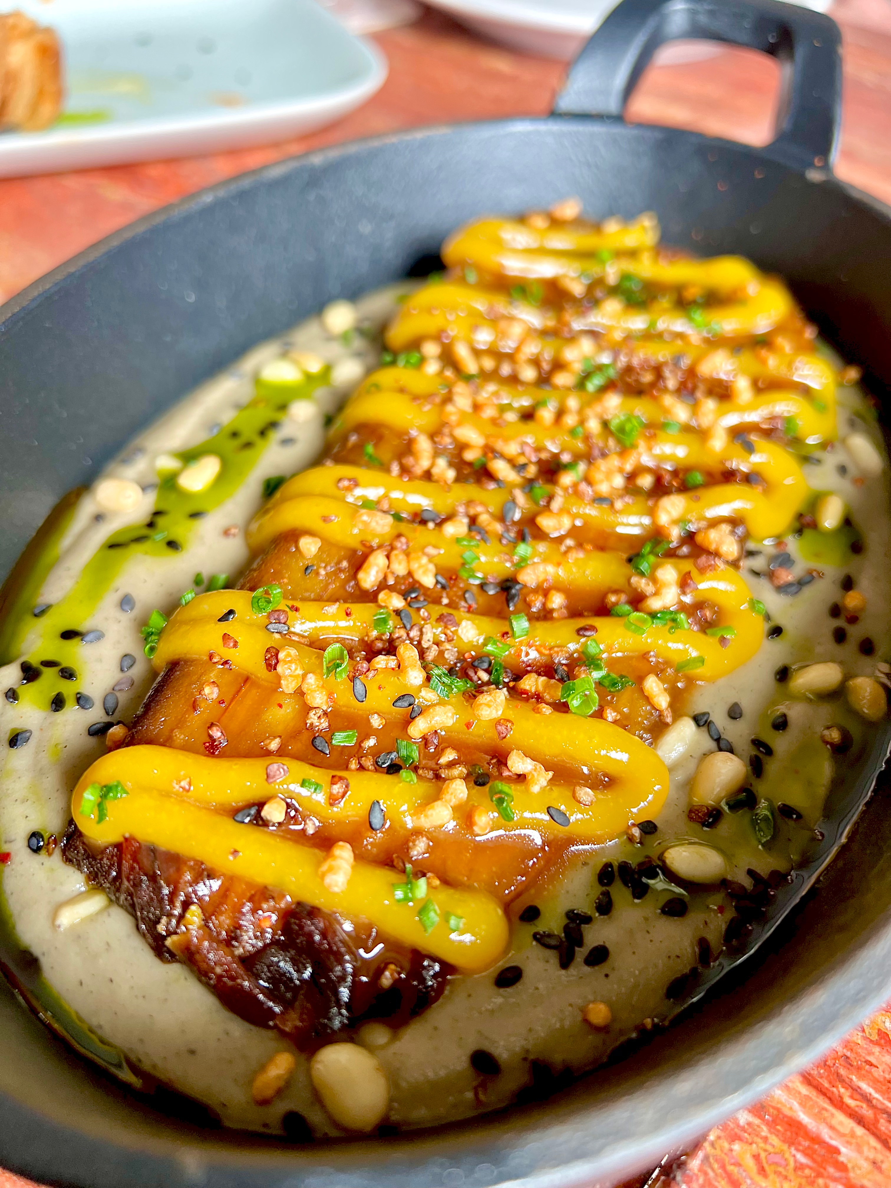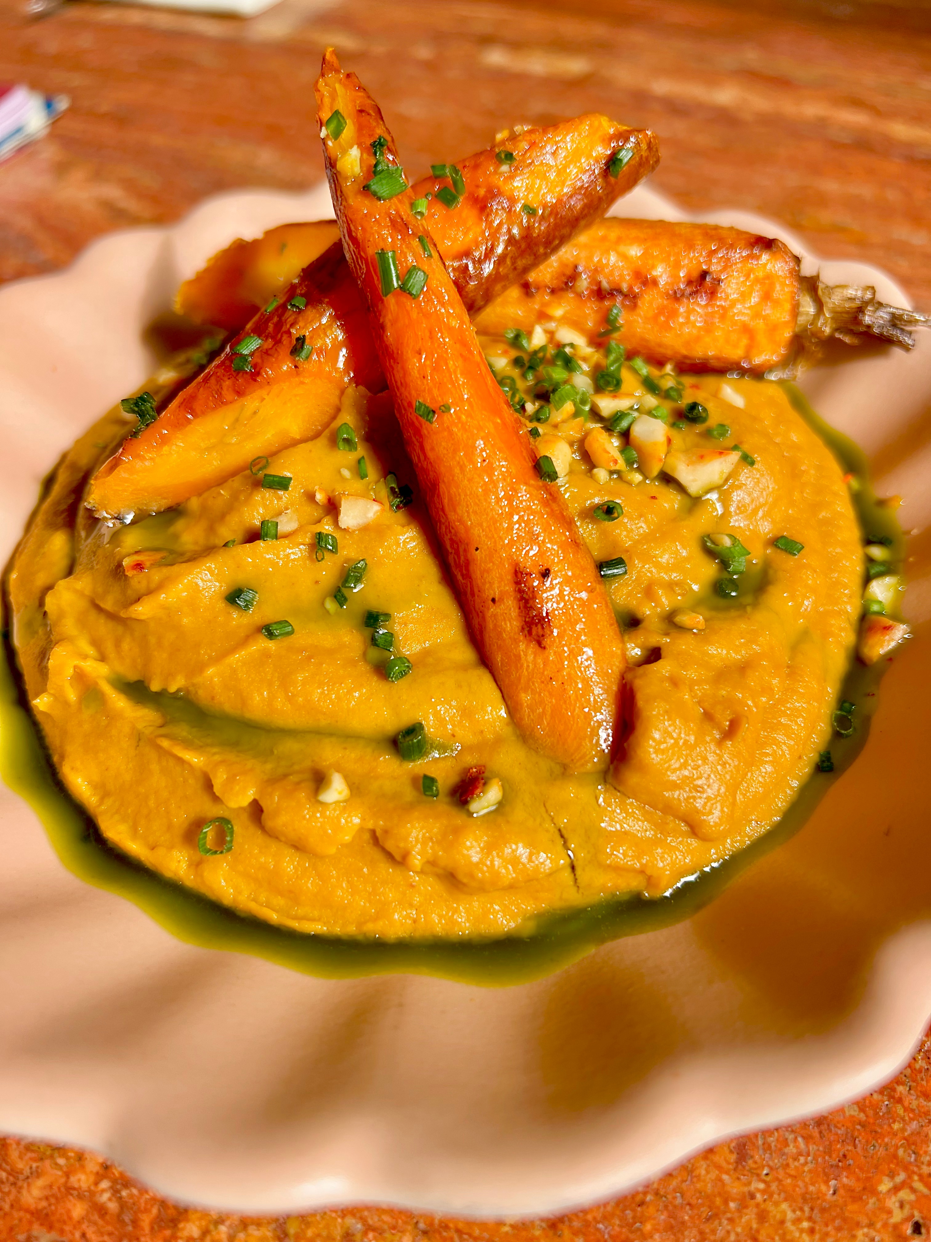 En accompagnement, la purée de carotte enivrée du curry rouge chante toutes les louanges du miel et de la cacahuète.