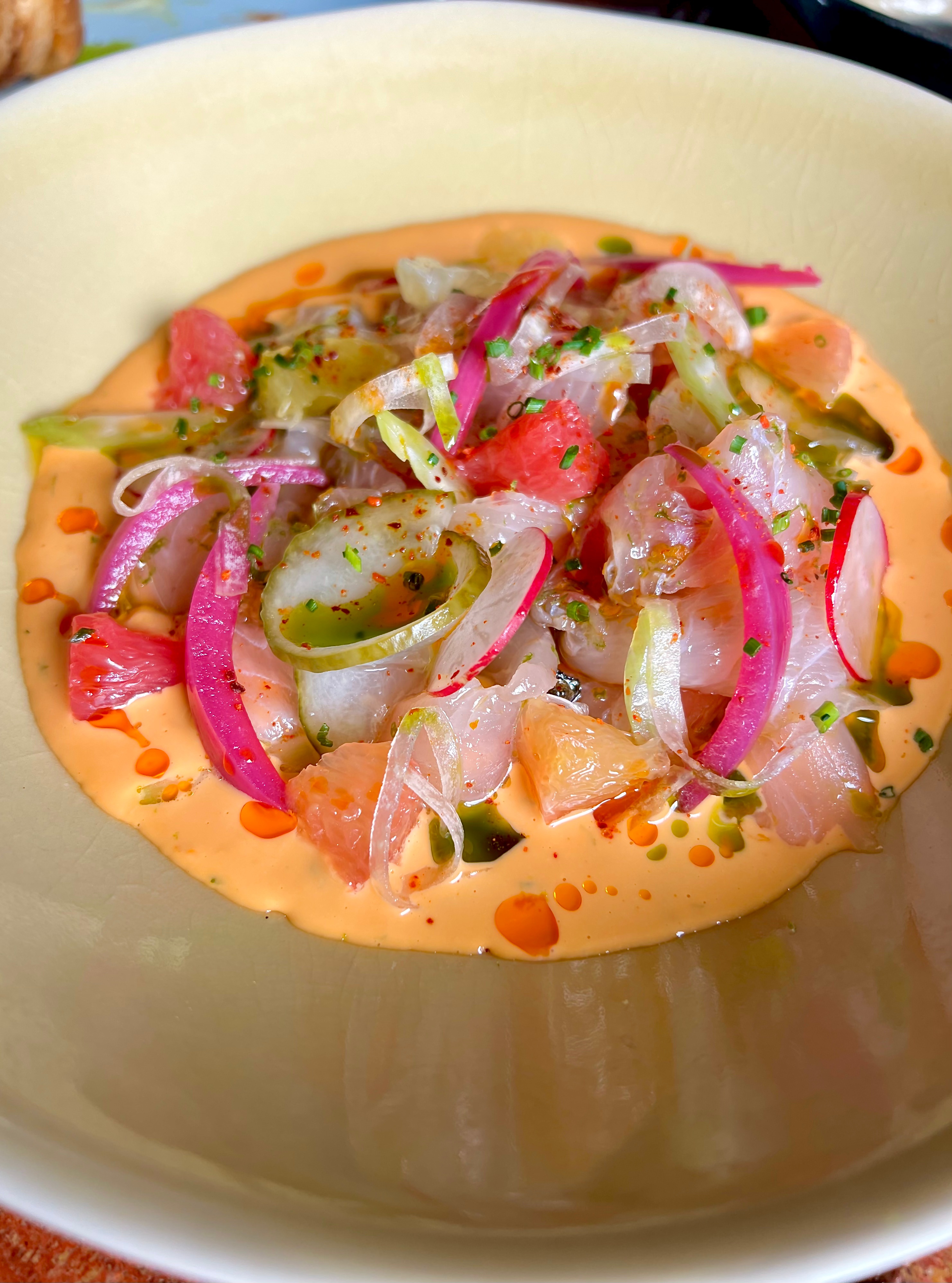 Ceviche de mulet méditerranéen : ce savoureux poisson de chez-nous, d’abord saumuré pour lui donner une douce mâche, se dimensionne du scintillant velours de crevettes. Fait à base de crevettes torréfiées au four mixées avec de l’huile, puis montées comme une mayonnaise assouplis des agrumes (citron vert, orange citron jaune), ce velours, accentué des virgules de basilic et de l’huile de crevettes, est une sauce à part entière et multidimensionnelle. A nouveau, les pickles, comme ceux de radis, d’oignons rouges et de segments de cédrats et pamplemousse, viennent célébrer cette assiette dans le vif et la sagacité des goûts.