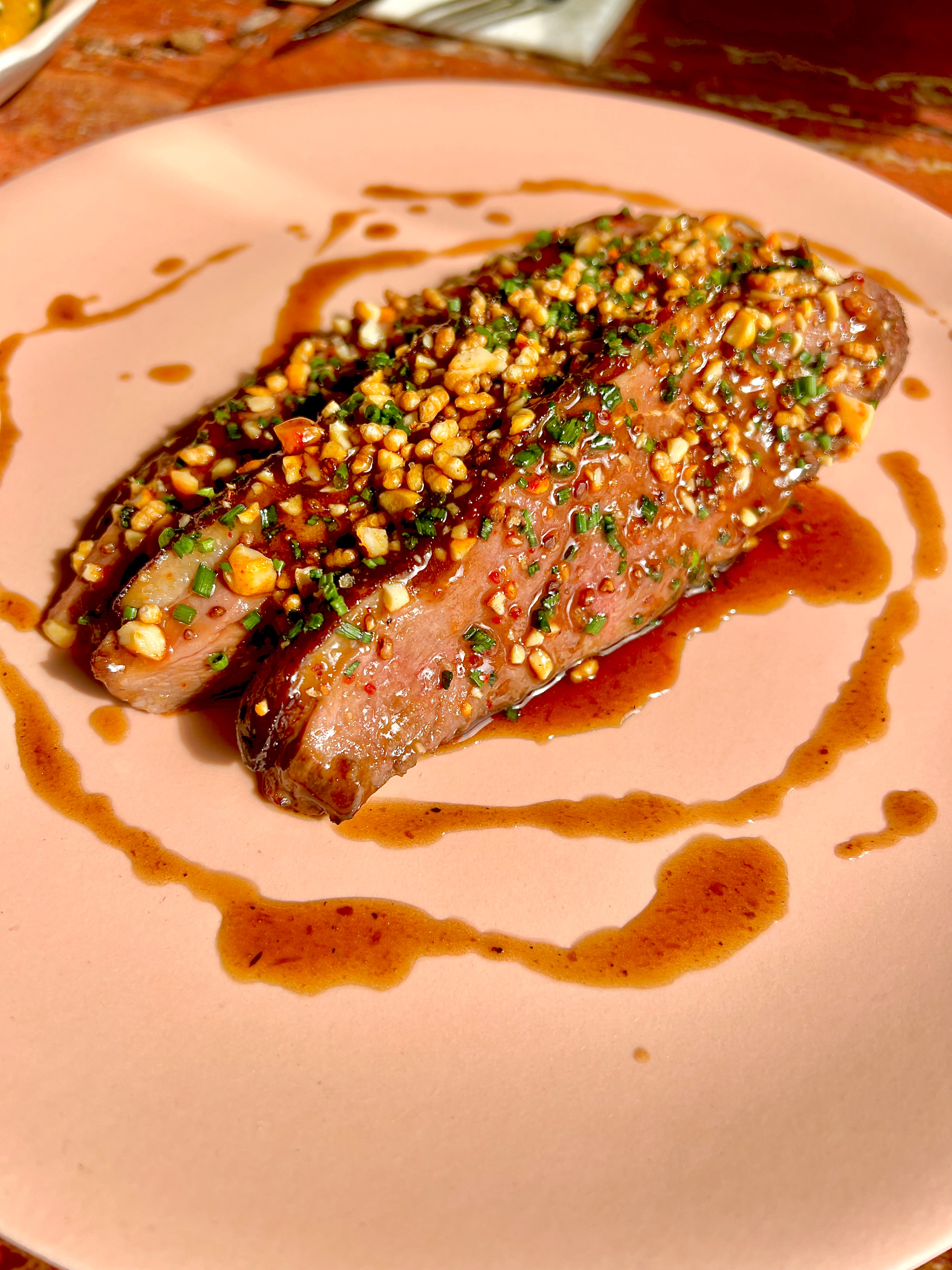 Le Magret de Canard au Miso Piquant & Carotte, Cacahuète : ce sublime magret, qui est maturé un mois de sa peau frottée au miso épicé, s’envole vers l’Asie. Il est cuit en deux cuissons à la perfection, d’abord à peine marqué et mis au repos, puis il est engourmandisé au beurre noisette et laqué au miso. Le riz soufflé et la cacahuète délivrent le judicieux croque en bouche. Le jus de viande éclairé de la citronnelle et du gingembre dimensionne le canard dans un raffinement exotique.