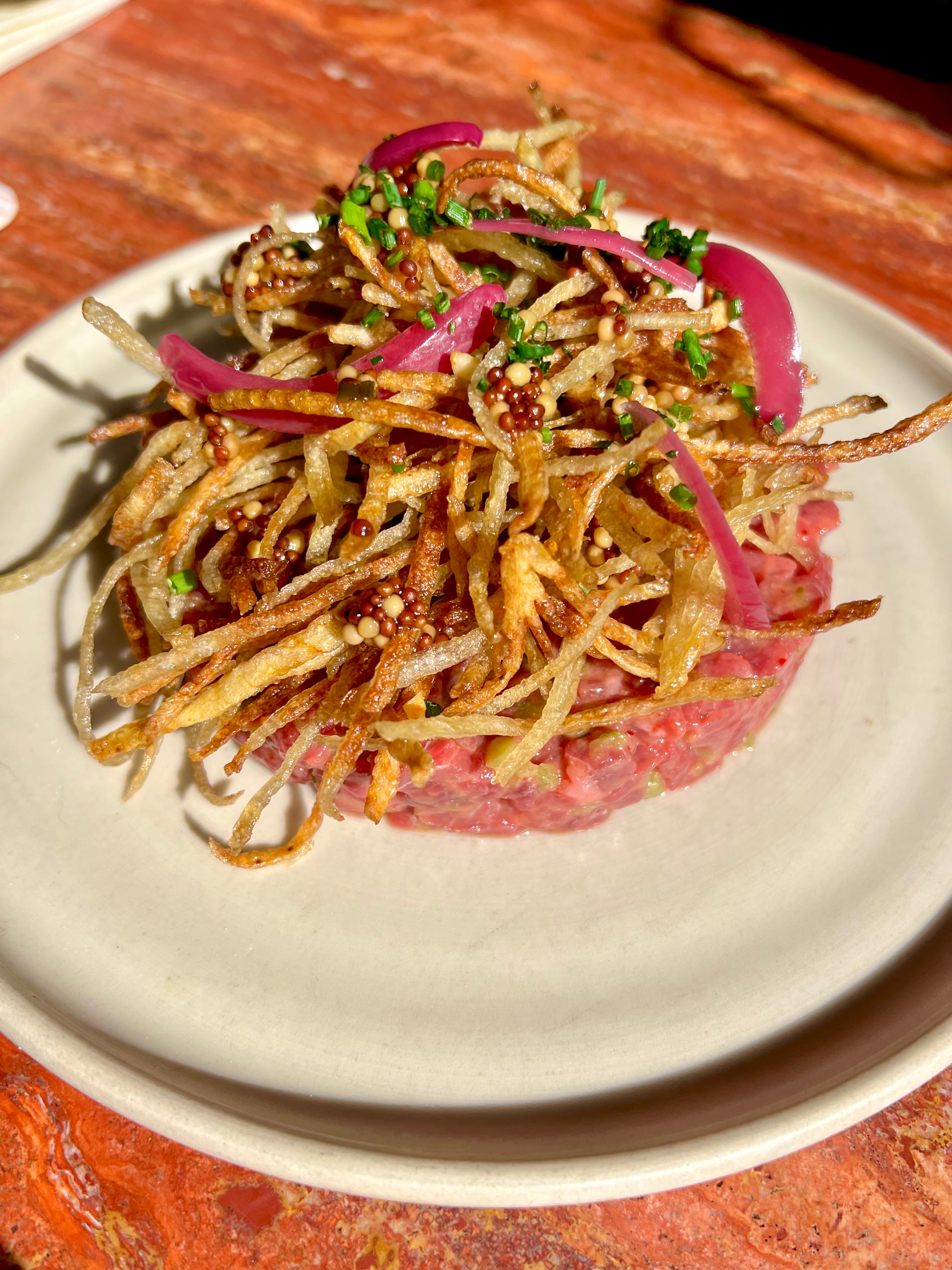 Le Tartare de Bœuf : ce tartare de bœuf de race Charolaise coupé au couteau, se fait « new style » et se pickles de câpres et d’oignons rouges, mais surtout de la jubilatoire claquance des graines de moutarde. Les frites allumettes, loin d’être ordinaires (ce serait trop simple de la part de Bastien), apportent une vraie dimension supplémentaire. Travaillées en saumure pour allier souplesse et croustillant, puis déposées sur le tartare, elles diffusent une chaleur subtile qui arrondit les saveurs et fait littéralement craquer de joie à chaque bouchée.
