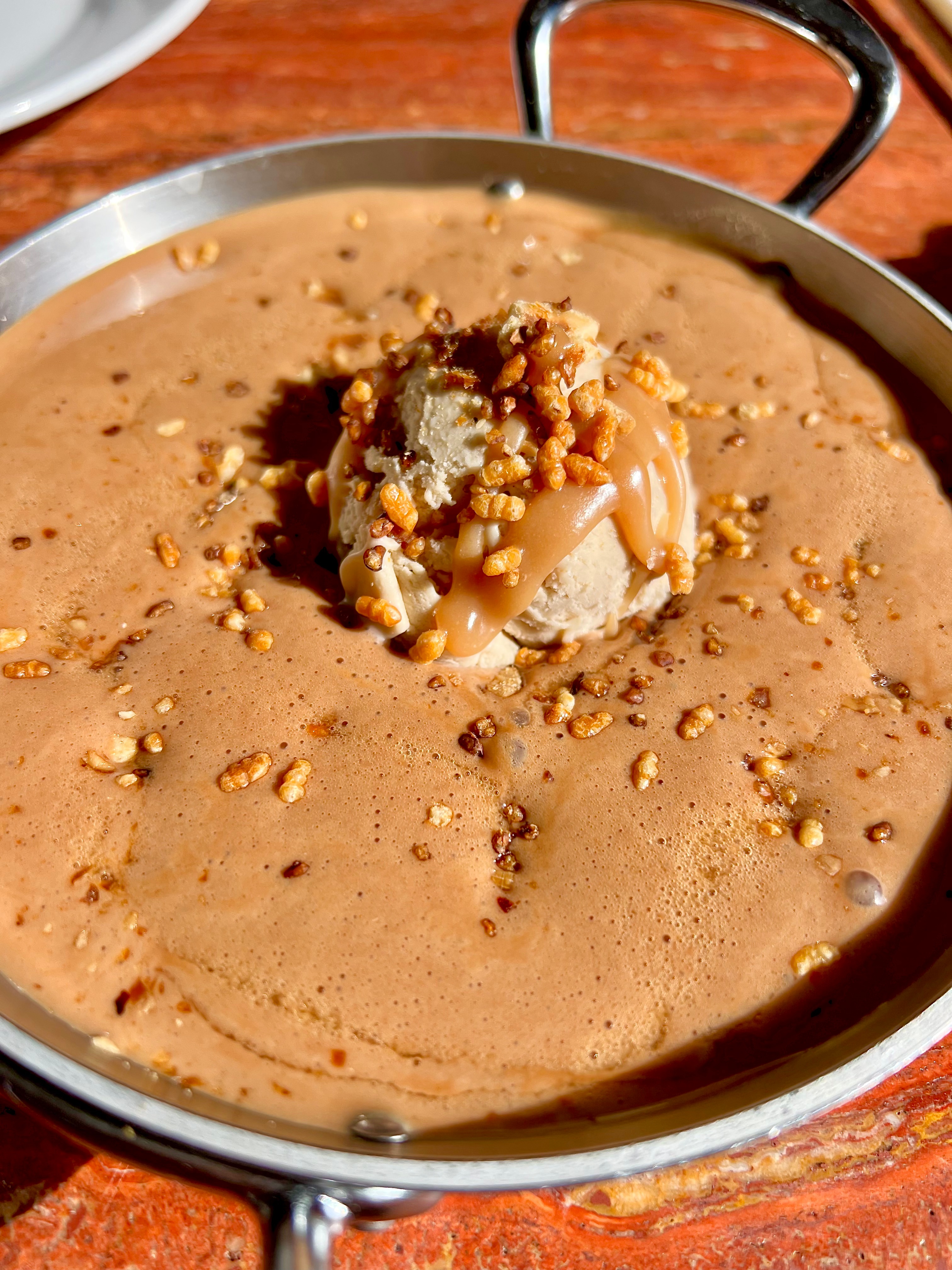 Le Crémeux au chocolat au lait Soufflé minute : ce crémeux intense du chocolat noir en siphon se crème de vie de la glace noisette du Piémont signée Louis Dubois, expert reconnu pour la qualité et l’origine de ses produits. L’ensemble s’accorde à merveille, sublimé par des touches de riz soufflé et de caramel au beurre salé : un dessert aussi réconfortant que sophistiqué.