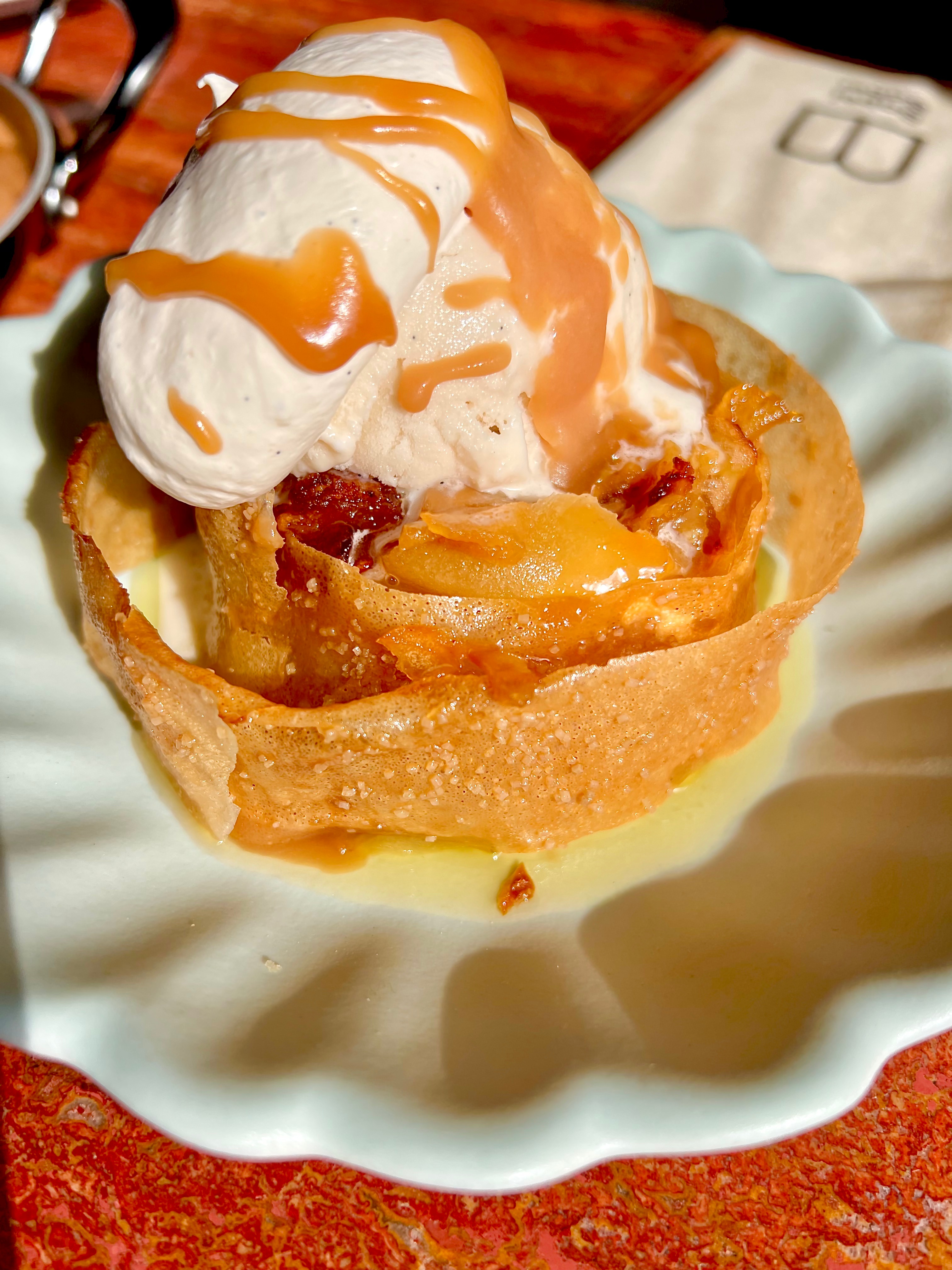 Les dessert se font aériens, légers et frais, mais surtout ultra gourmands. Pomme pomme pour Babel Babel : ces belles reinette rôties au cidre en filigrane des agrumes, se déclinent en une Tatin revisitée en feuilles à feuilles de brick délicatement lustrées d’un beurre noisette. La glace au yaourt et la crème vanillée se bénissent du voluptueux caramel au beurre-salé.