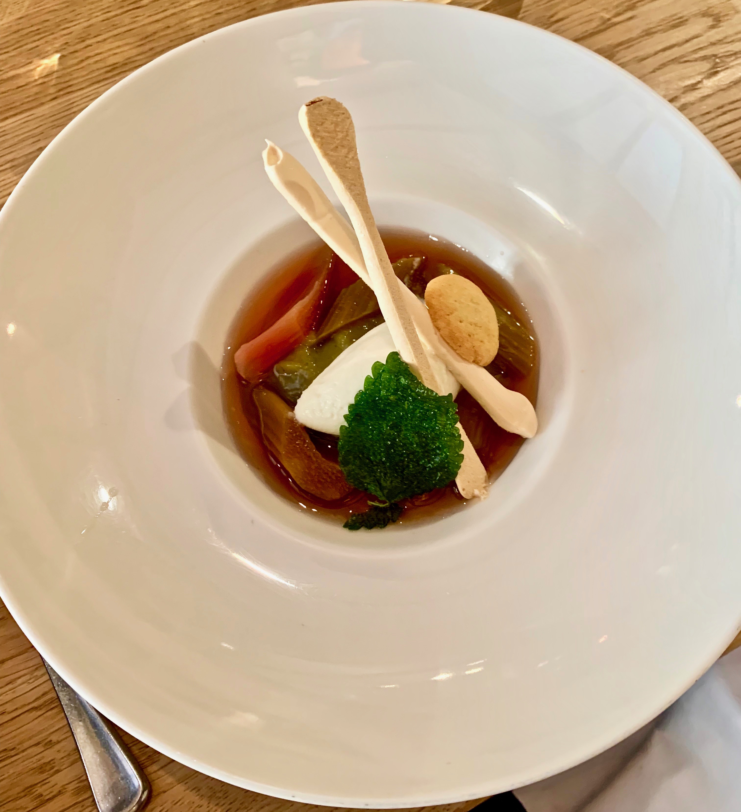 La rhubarbe à la mélisse et pamplemousse, pochée à la bière de Tourettes, glace à la fleur de sureau, meringue et biscuit ©lepetitlugourmand