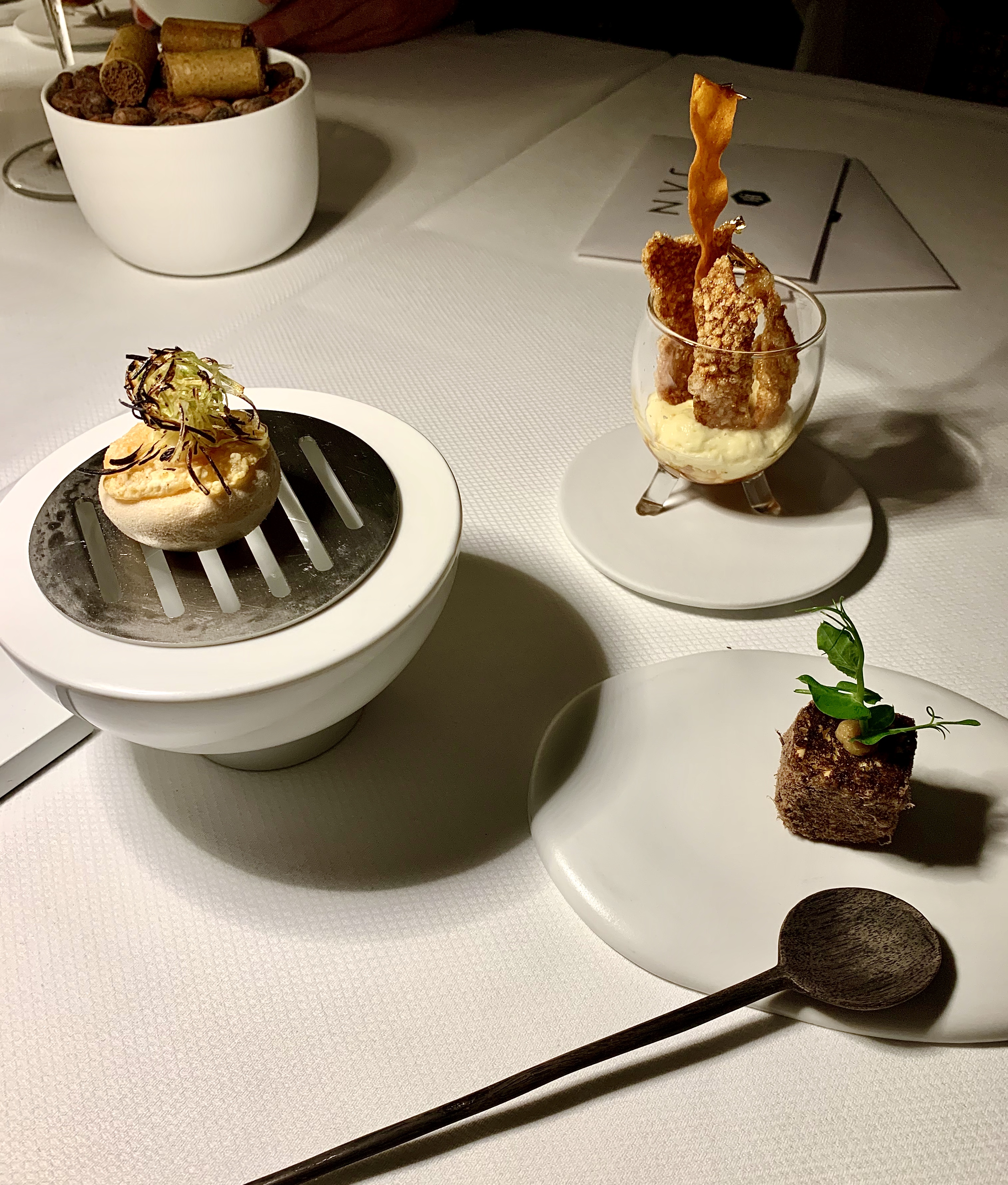 Quatre étonnants amuses-bouches : le sandwich ( comme un macaron ) cuit et fumé sur le braai, le Mieliepap, le Biltong et le cigare crème de champignons cacao bio ©lepetitlugourmand